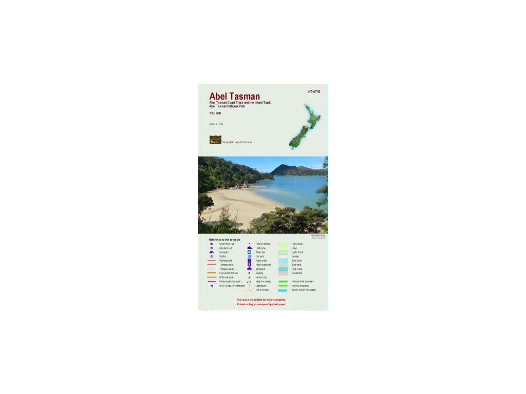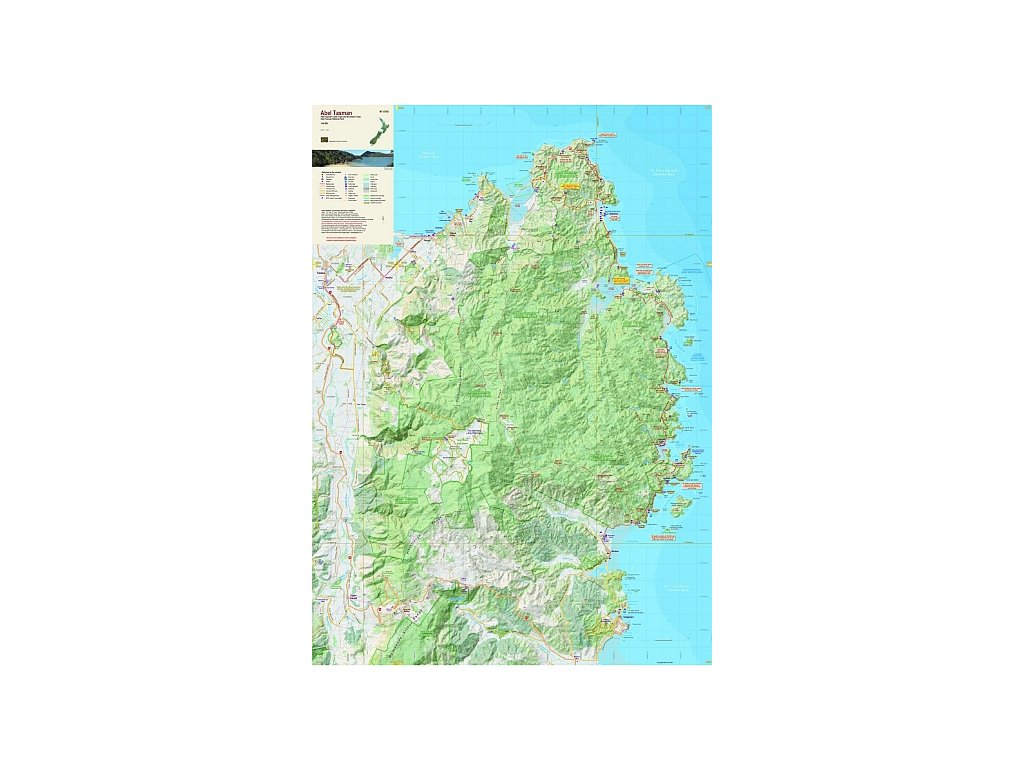 Turistická mapa oblasti Abel Tasman na precizním topografickém podkaldu s veškerými turistickými informacemi (trasy,chaty, kempy a apod.) v měřítku 1:40 000 .