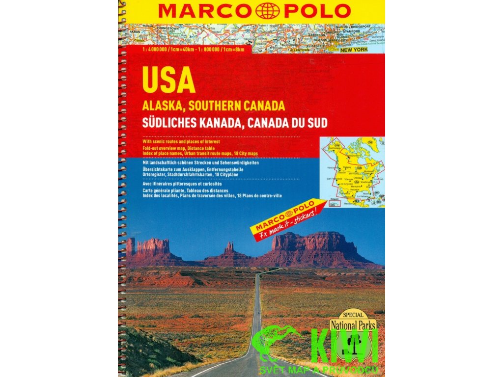 Autoatlas USA zahrnující i Aljašku a jižní Kanadu ve formátu A4. Základ mapových listů tvoří silniční síť s kilometráží úseků doplněná o značení čerpacích stanic, uzavřených úseků komunikací, lodních linek, železnice apod. Nechybí ani turistické informace - možnosti ubytování, chráněná území, odpočívadla, zvýrazněné turistické zajímavosti a panoramatické úseky cest. Výškopis naznačen stínováním reliéfu. Součástí atlasu je i tabulka vzdáleností, přehled národních parků a 18 plánů měst. Nechybí rejstřík míst. Vydání 2012.