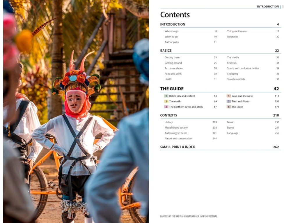 Průvodce Rough Guide po Belize s Tikalem a Floresem obsahuje: Belize City a okres, sever, severní Cayes a atoly, Cayo a západ, Tikal a Flores, jih.