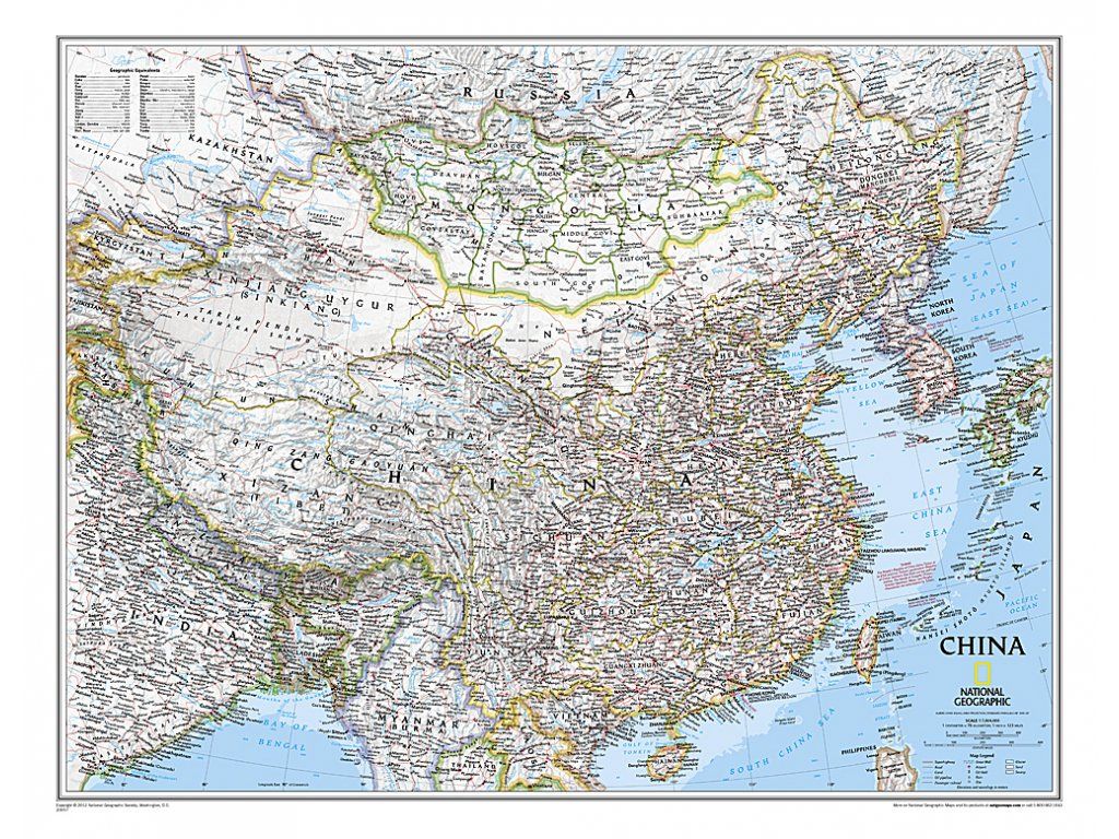 Mapa Číny v klasickém stylu National Geographic je jednou z nejuznávanějších map země. Pokrytí zahrnuje také hraniční oblasti sousedních zemí, celý Korejský poloostrov, Tchaj-wan a některé japonské ostrovy spolu s Východočínským a Jihočínským mořem.