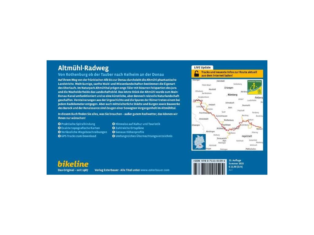 Cykloprůvodce "Altmühl - Von Rothenburg ob der Tauber nach Kelheim an der Donau" vydavatelství Esterbauer nás tentokrát zavede do německé spolkové země Bavorsko. Trasa o celkové délce 250 km je rozdělena do několika etap, v rámci nichž naleznete popis cesty, výškový profil, náročnost a stručnou charakteristiku trasy, výchozí a konečný bod výletu, délku trasy. Zdůrazněny jsou zajímavosti, které cestou potkáte, kontakty na ubytování a občerstvení a také je zmíněna stručná historie oblasti. Každá etapa je zakreslena do několika přehledných map v měřítku 1:50 t. (poměr map a textu je půl na půl) a doplněna o ilustrační barevné fotografie. Kroužková vazba, formát 225x120 mm, 120 stran v laminované úpravě. Vydání 2023.