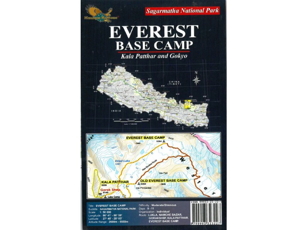 Detailní mapa oblasti Everstu v měřítku 1:50 000 a oblíbeného treku z Lukly k Everest BC. Tento trek trvá zpravidla 10 -12 dní e je hodncoen jako středně náročný, vede z Lukly přes Namche Bazar, Tengboche, Pangboche, Lobuche na Kala Patthar do oblasti ledovce Khumbu a k samotnému základnímu táboru pod Mount Everestem. Mapa zobrazuje i údolí Dudh Koshi a trek pod Gokyo. Mapa obsahuje také jednoduchý výškový profil treku a orientační časové a výškové údaje .