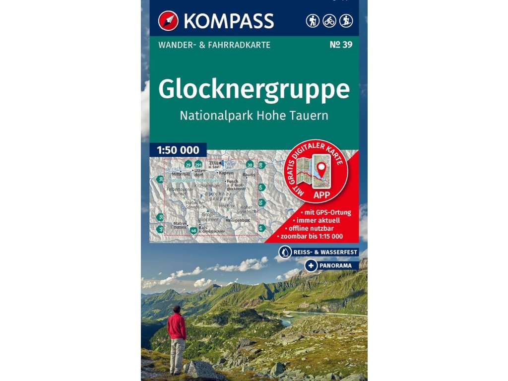 Mapa oblasti Glocknergruppe – Nationalpark Hohe Tauern - turistická mapa od vydavatelství Kompass obsahuje aktuální značené turistické trasy, doporučené cykloturistické trasy a kompletní informace o turistických zajímavostech v okolí. A to vše na kvalitním topografickém mapovém podkladu. Podpora GPS je samozřejmostí.