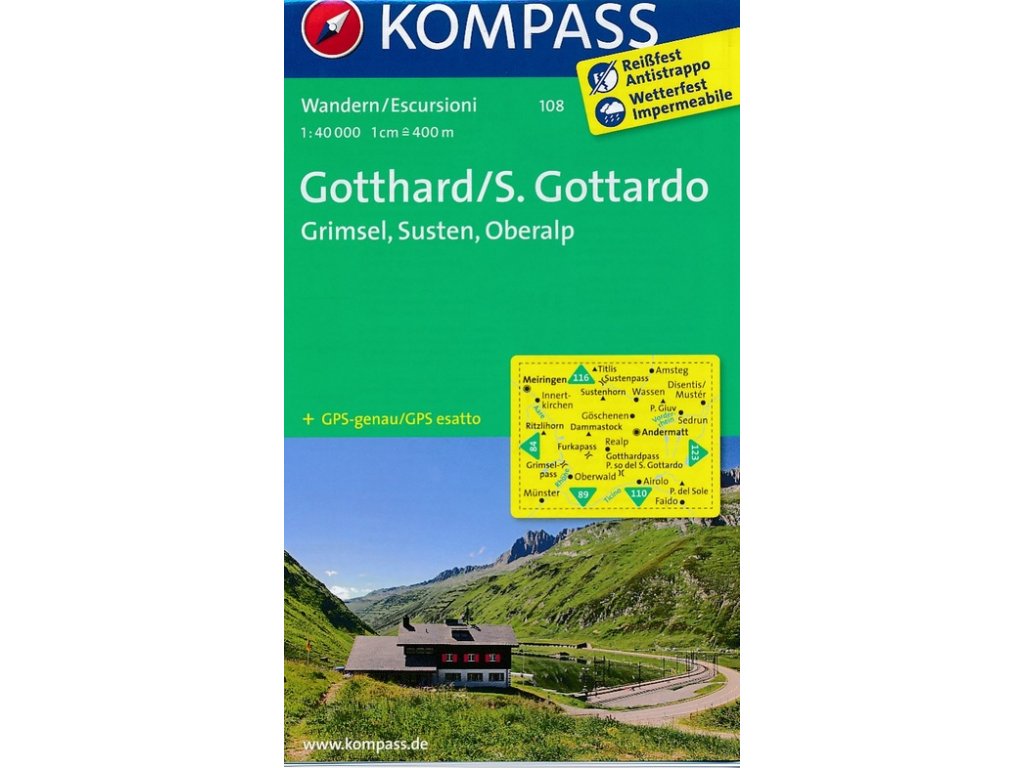Mapa oblasti Gotthard - Grimsel - Susten - Furka - Oberalp - turistická mapa od vydavatelství Kompass obsahuje aktuální značené turistické trasy, doporučené cykloturistické trasy a kompletní informace o turistických zajímavostech v okolí. A to vše na kvalitním topografickém mapovém podkladu. Podpora GPS je samozřejmostí.
