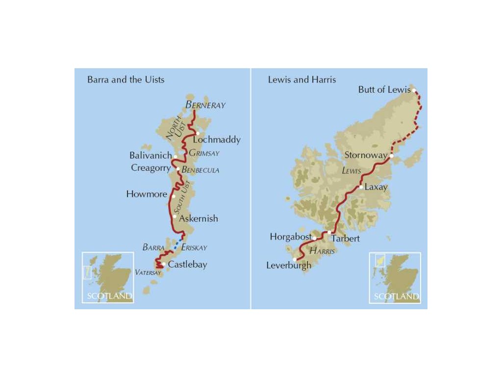 247 km dlouhá (155 mil) značená trasa přes drsné kopce a oslnivě bílé pláže z mušlového písku po celé délce Vnějších Hebrid – od Vatersay na jihu po Stornoway na severu – prochází přes 10 ostrovů propojených hrázemi a trajekty.