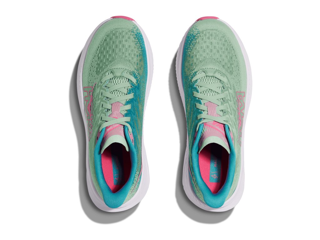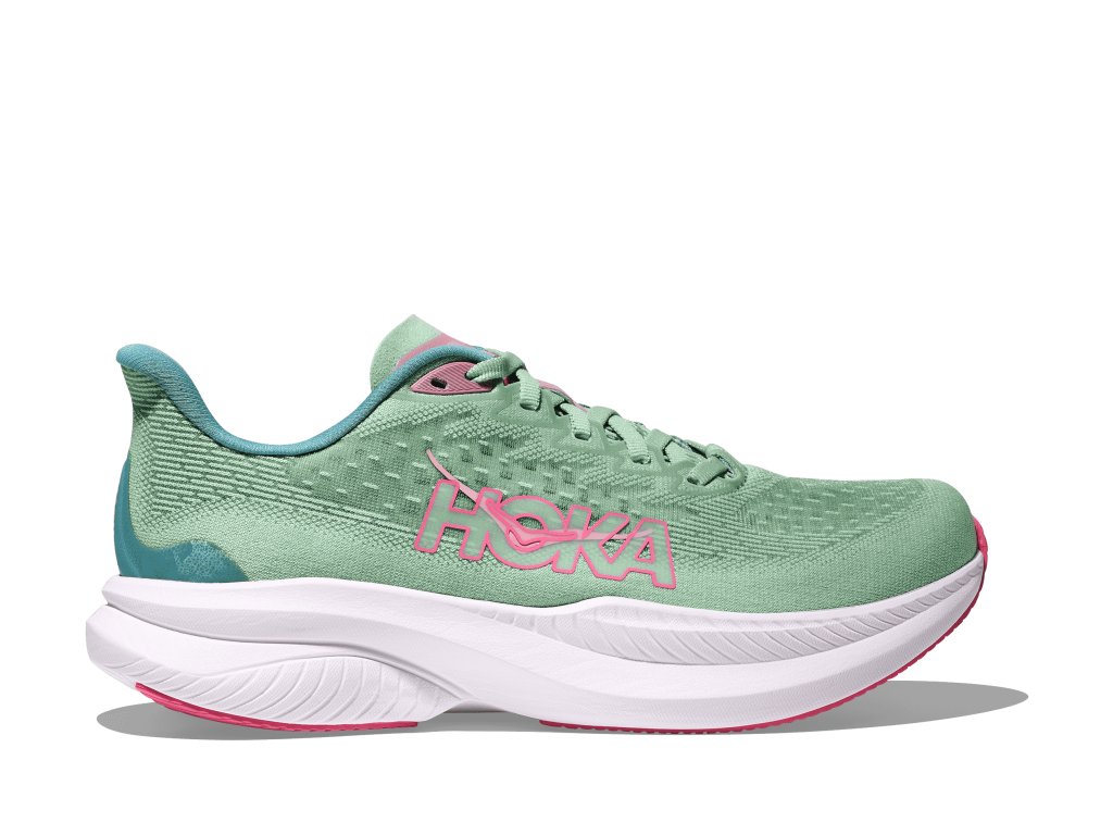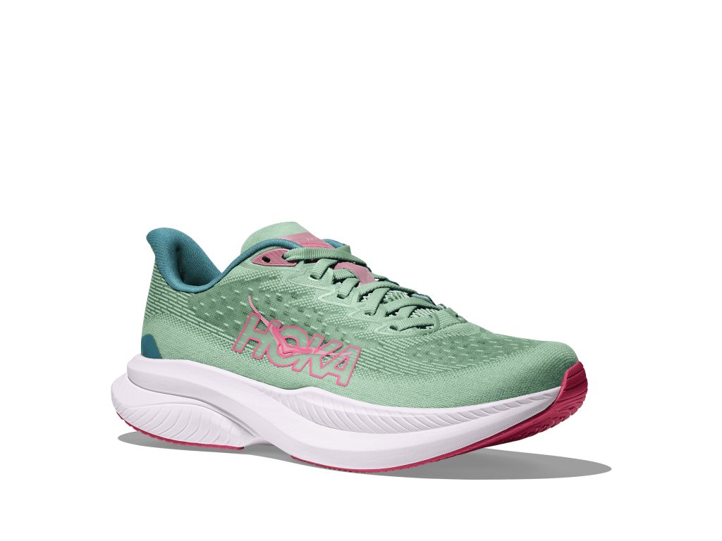 Dámská běžecká obuv HOKA Mach 6 – lehká, rychlá a pohodlná silniční bota s novou pěnou a technologií Meta-Rocker.