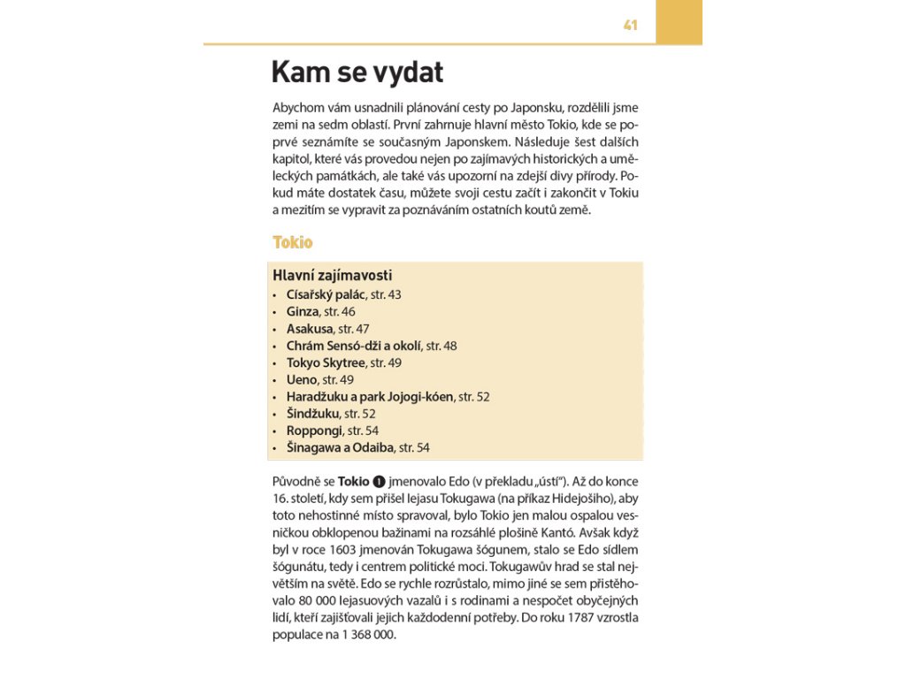 Nechte se inspirovat bezpočtem půvabných míst, která přímo vybízejí k návštěvě. V úvodu knihy najdete tři itineráře: první vás během dvanácti dní provede největšími a nejzajímavějšími městy v Japonsku. Díky druhému itineráři prozkoumáte významná historická místa v zemi. A třetí vám představí lázeňské město Hakone.