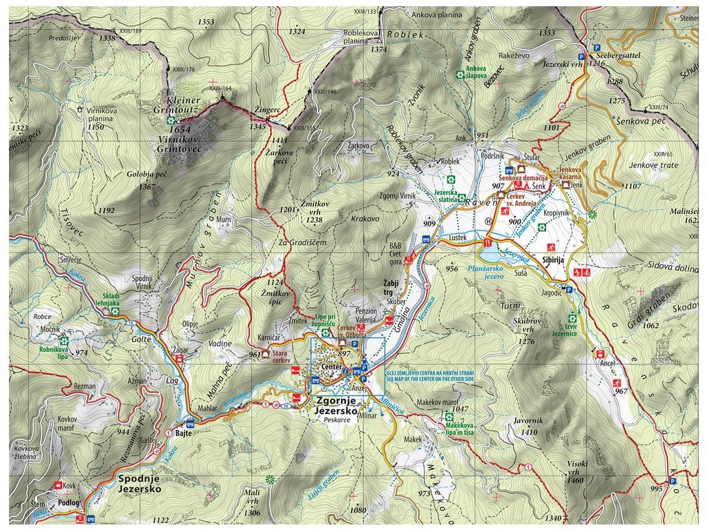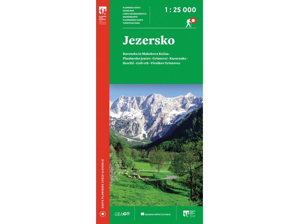 Mapa pokrývá oblast obce Jezersko. Nejoblíbenější túry jsou na Grintovec, Rinkas, Velika Baba, Ledinski vrh, Pristovški Storžič, Virnikov Grintovec, Kočna a Storžič. Tato mapa nabízí několik možností pro příjemné rodinné procházky údolím Ravenska Kočna a Makekova Kočna nebo výlety do partyzánské nemocnice, pramen kyselé vody, vodopády Ankovi slapovi a vodopád Čedca, kostel Stará cerkvev nad vesnicí a další. Zadní strana mapy obsahuje informace o horských chatách, turistických stezkách, skialpinistických trasách, chatách, parkovištích, zastávkách veřejné dopravy, možnostech ubytování, mnoha přírodních a kulturních zajímavostech, lezeckých stěnách a mnohem více.
