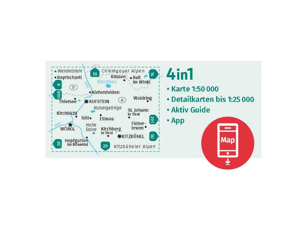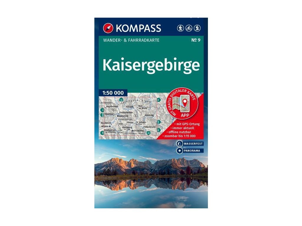 Mapa oblasti Kaisergebirge - turistická mapa od vydavatelství Kompass obsahuje aktuální značené turistické trasy, doporučené cykloturistické trasy a kompletní informace o turistických zajímavostech v okolí. A to vše na kvalitním topografickém mapovém podkladu. Podpora GPS je samozřejmostí.