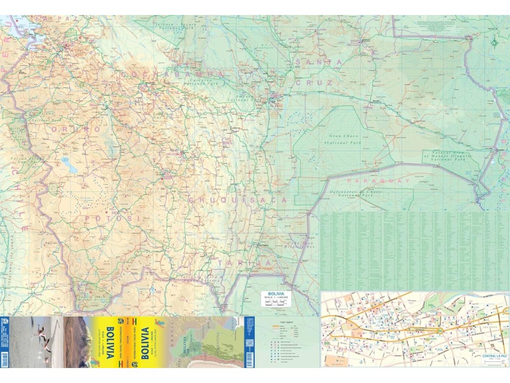 Oboustranná automapa Bolívie s bohatým turistickým obsahem. Mapa obsahuje silniční síť s kilometráží úseků a číslováním silnic. Symbolickými znaky značené památky, turistické zajímavosti, národní parky, tábořiště, turistické atrakce. Výškopis je zobrazen pomocí barevné hypsometrie. Zeměpisné souřadnice. Rejstřík míst. Ve výřezech plánky městských center La Paz, Santa Cruz de la Sierra a Potosí. Vydání 2025.