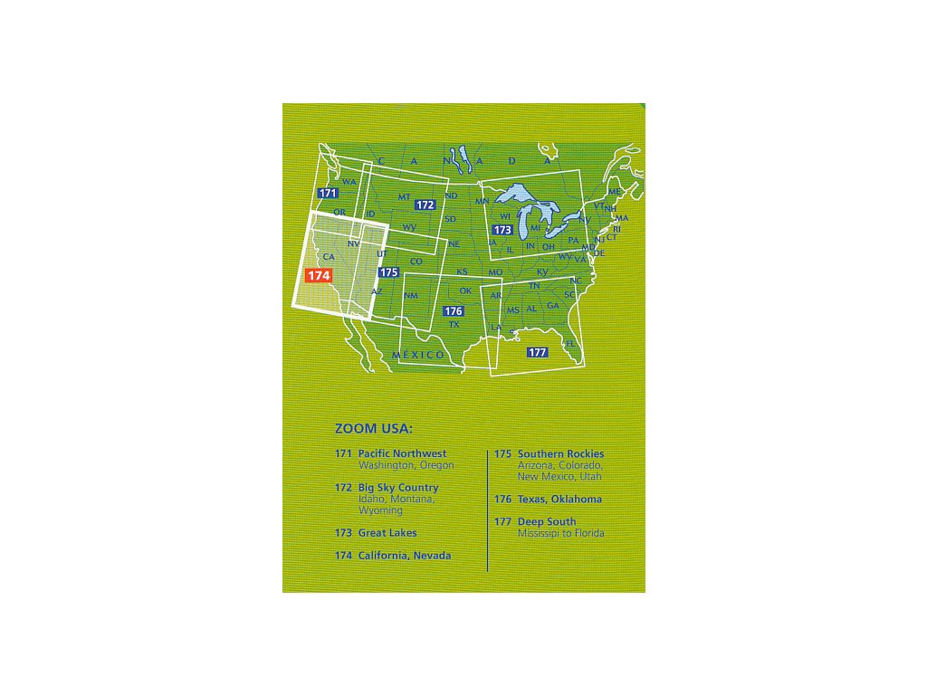 Jednostranná automapa Kalifornie a Nevady s turistickou tematickou vrstvou v měřítku 1:1 267 200. Silniční síť je doplněna o kilometráž úseků a číslování silnic. Zaznačeny jsou lodní linky a úseky cest s panoramatickým výhledem. Turistickou část zastupují symbolické znaky, které mapují kulturní, historické a přírodní zajímavosti. Výškopis naznačen stínováním reliéfu. Po straně mapy naleznete rejstřík sídel a turistických zajímavostí. Ve výřezech pak tabulka vzdáleností a průjezdové mapy měst (Los Angeles, San Francisco, Phoenix, San Diego, Salt Lake City, Las Vegas). Seznam místních svátků a festivalů, seznam národních parků, rejstřík vybraných zajímavostí, rejstřík sídel dle zemí. Čtyřjazyčná legenda. Vydání 2013.
