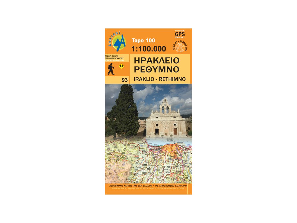 Jednostranná turistická mapa centrální části Kréty je zpracovaná na voděodolném materiálu. Mapa zachycuje síť silnic (včetně kilometráže, benzínové stanice), důležité orientační body, tábořiště, možnosti občerstvení, kulturní památky (kláštery, muzea, antické zríceniny), výškopis pomocí vrstevnic po 100 m. Mapa obsahuje GPS souřadnice WGS 84. Na rubové straně nalezente rejstřík sídel. Veškerý popis jak v řečtině, tak v angličtině. Velmi přehledně a podrobně zpracovaná mapa určena pro cykloturistiku. Vydání 2019.