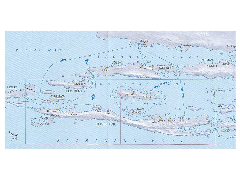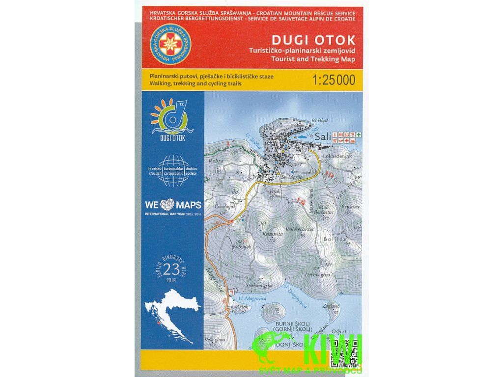 Oboustranná mapa chorvatského ostrova Dugi v měřítku 1:25 000. Výškopis je v mapě vyjádřen pomocí stínování, vrstevnic po 10 metrech a výškových kót. Silniční síť je členěna do tří úrovní, dále jsou vyznačena sídla, vodopis, hranice chráněné oblasti, cyklotrasy, pěší trasy, naučné stezky. Pomocí symbolů jsou pak vyznačena místa turisticky zajímavá či užitečná, jako např.: kostel, památník, sportoviště, pramen, jeskyně, informační centra, pošta, restaurace, zdravotnická zařízení, kempy, hotely, apartmány, čerpací stanice, pláže, přístavy,... GPS souřadnice. Na okrajích mapy dvojjazyčná legenda a stručné turistické informace v angličtině a chorvatštině doplněné o barevné ilustrativní fotografie. Vydání 2016.