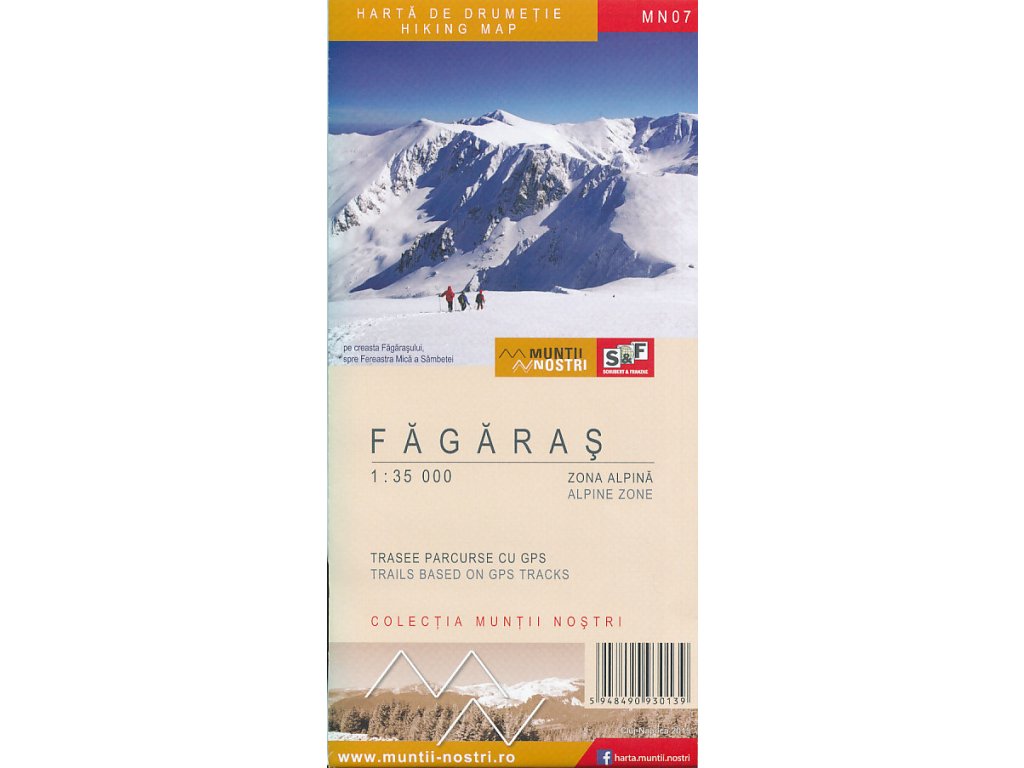 Soubor dvou jednostranných map rumunského pohoří Fagaraš - jedna mapa v měřítku 1:75 000 a druhá mapa v podrobnějším měřítku 1:35 000. Výškopis v mapě vyjádřen pomocí stínování, vrstevnic po 50ti metrech a výškových kót. Dále vyznačeny lesy, oblasti kleče, zastavěné plochy (sídla), skály, hranice národních parků a přírodních rezervací, vodopis, lanovky, vleky a pěší turistické trasy (odlišeny zimní trasy a trasy s nedostatečným značením v terénu). Pomocí symbolů jsou zobrazena místa turisticky zajímavá či užitečná, jako např.: informační centra, různé druhy ubytování, kostely, dřevěné kostely, kláštery, muzea, pošty, prameny, obtížná místa, stanice horské služby apod. GPS souřadnice. Po okrajích mapy a na rubové straně stručný popis pěších tras (rumunsky a anglicky) s grafy převýšení, časovou náročností a s příslušným číselným označením. Tento popis doplňují barevné ilustrativní fotografie. Zobrazené území mapy 1:75 000: JV-Dragoslavele, Rucar, JZ-Perisani, Balota, SZ-Talmaciu, Avrig, SV-Marigineni. Zobrazené úzení mapy 1:35 000: JV-Muntele Draghina Mare, JZ-Muntele Stana Mare, Z-Vf. Suru (2.283 m n.m.), SZ-Vf. Clabucetu (1.253 m n.m.), Curmatura Moldelor (1.165 m n.m.), SV-Vf. Trasnita (2.077 m n.m.), V-Curmatura Mosului, Vf. Leaota. Vydání 2023.