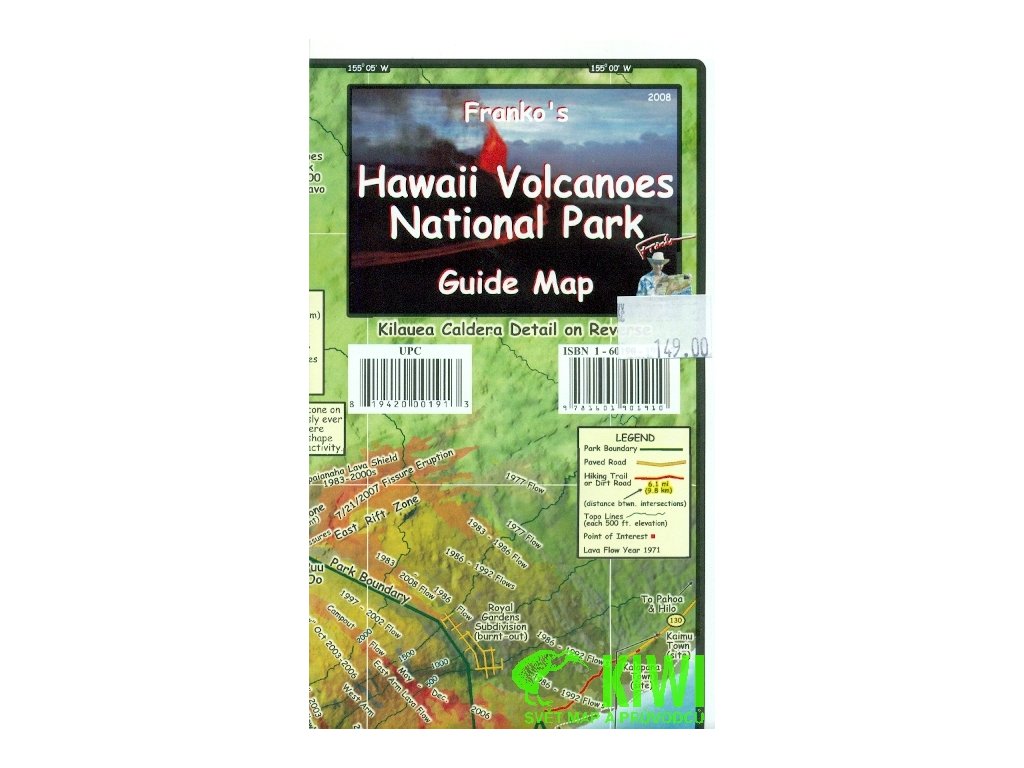 Jednostranná mapa národního parku Hawaii Volcanoes vyrobená z voděodolného materiálu. Silniční síť s kilometráží, turistické trasy, zajímavá místa. Popis nejzajímavějších míst v angličtině. Na druhé straně mapy se nachází detail kaldery sopky Kilauea s vyznačenými turistickými trasami. Vydání 2008.