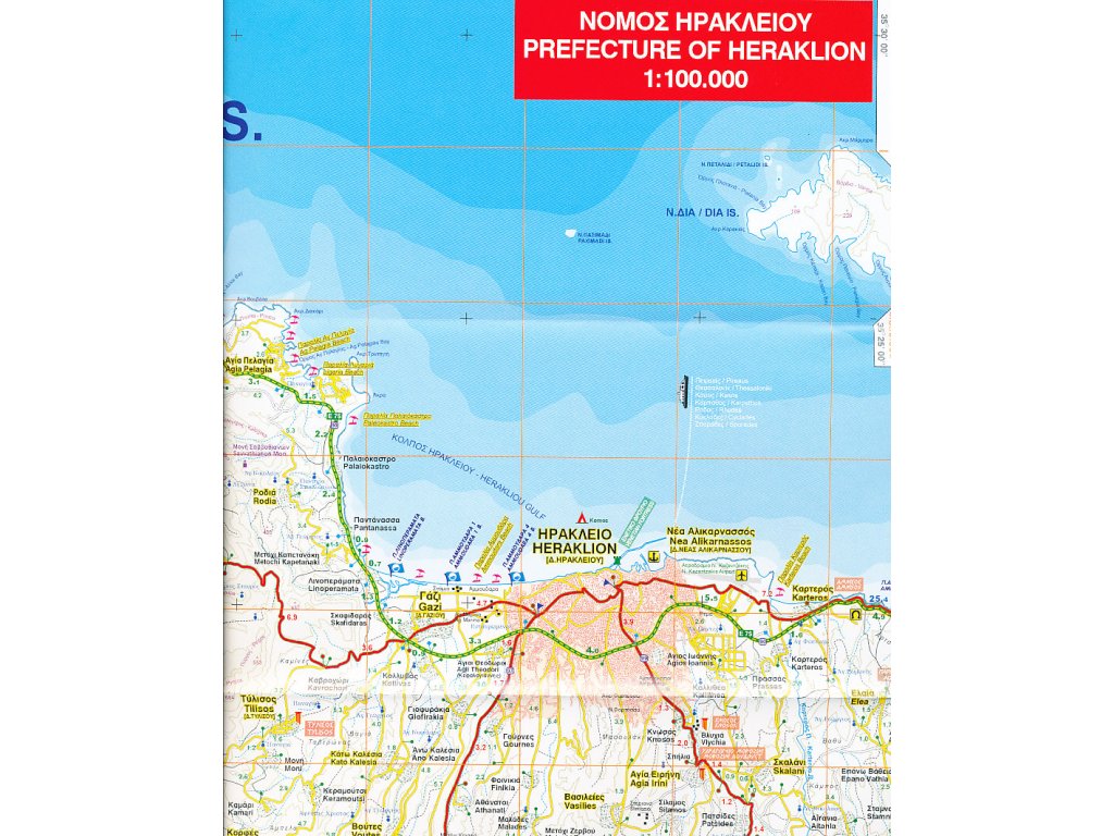 Mapa oblasti Heraklion na řecké Krétě (střední část ostrova) v měřítku 1:100 000. Silniční síť rozčleněna do 4 úrovní, doplněna o kilometráž. Sídla popsána jak řeckým písmem tak latinkou. Piktogramy jsou zobrazeny zajímavá či užitečná místa (kempy, pláže, přístavy, trasy trajektů, jeskyně, hrady, archeologická naleziště, kláštery, golfová hřiště apod.). Zobrazené území: JV - Tertsa, JZ - Kali Limenes, SZ - Skepasti, SV - Malia, Sisi. Na rubové straně plán města Heraklion (1:8 000) a památek Knosos a Faistos. Šestijazyčná legenda.