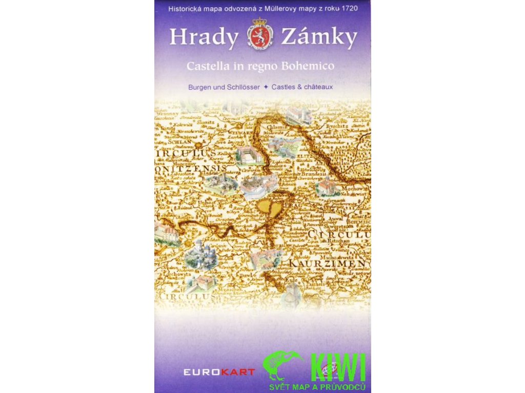 Zobrazení vybraných hradů, zámků a klášterů na podkladě historické mapy Čech odvozené na základě Müllerovy mapy z roku 1720. Na rubové straně rejstřík lokalit se stručným popisem. Vydání 2006.