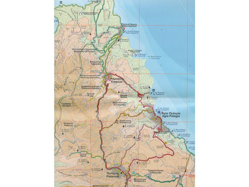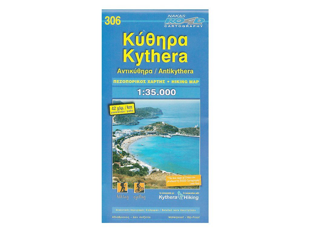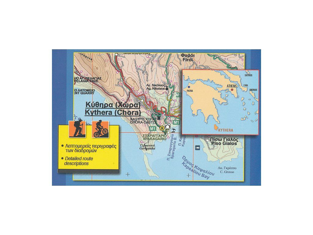 Jednostranná dobře čitelná mapa ostrova na speciálním materiálu odolném vůči poškození (oděru, roztrhání, vodě). Podrobně zaznačený topografický podklad a síť silnic (nejen hlavní, ale i horské cesty), která je doplněná o kilometráž úseků. Vyznačené pěší trasy (popsané na rubové straně) a trasy pro MTB. Symbolické znaky pro turistické zajímavosti, zvýrazněny panoramatické cesty, pláže vhodné ke koupání, majáky. Výškopis pomocí barevné hypsometrie a vrstevnic po 20 m. Popisy v mapě jak latinkou, tak řeckou abecedou. Na rubové straně turistické popis pěších tras v řečtině a angličtině doprovázený barevnými ilustrativními fotografiemi. Vydání 2015.