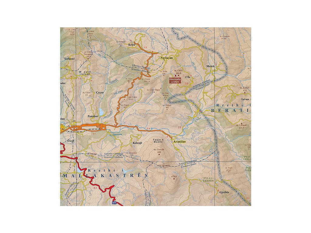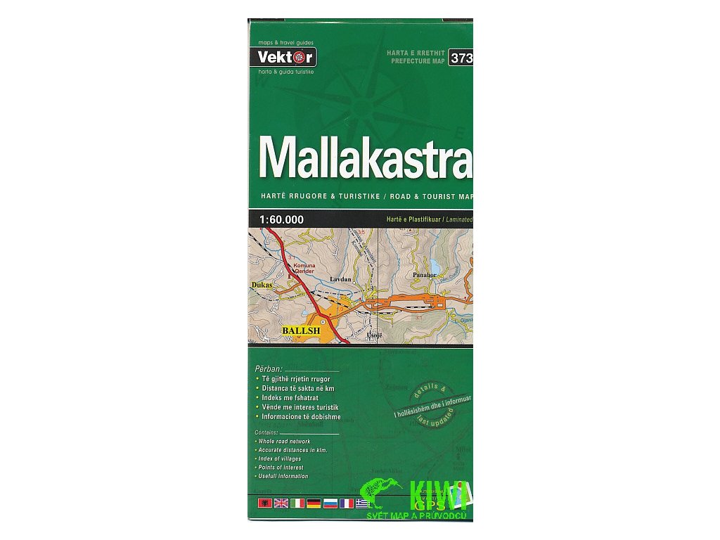 Mapa albánského okresu Mallakastra a okolí v laminované úpravě (jednostranná). Vzhledem k měřítku (1:60 000) je mapa využitelná jak pro turistiku tak při cestování autem. Silniční síť je rozdělena do 6 kategorií a doplněna kilometráží úseků. V mapě jsou vyznačeny turistické zajímavosti. Výškopis je znázorněn vrstevnicemi po 20 m, kótovanými body, stínováním i barevnou hypsometrií. Mapa je kompatibilní s GPS v systému WGS 84. Vydání 2013.