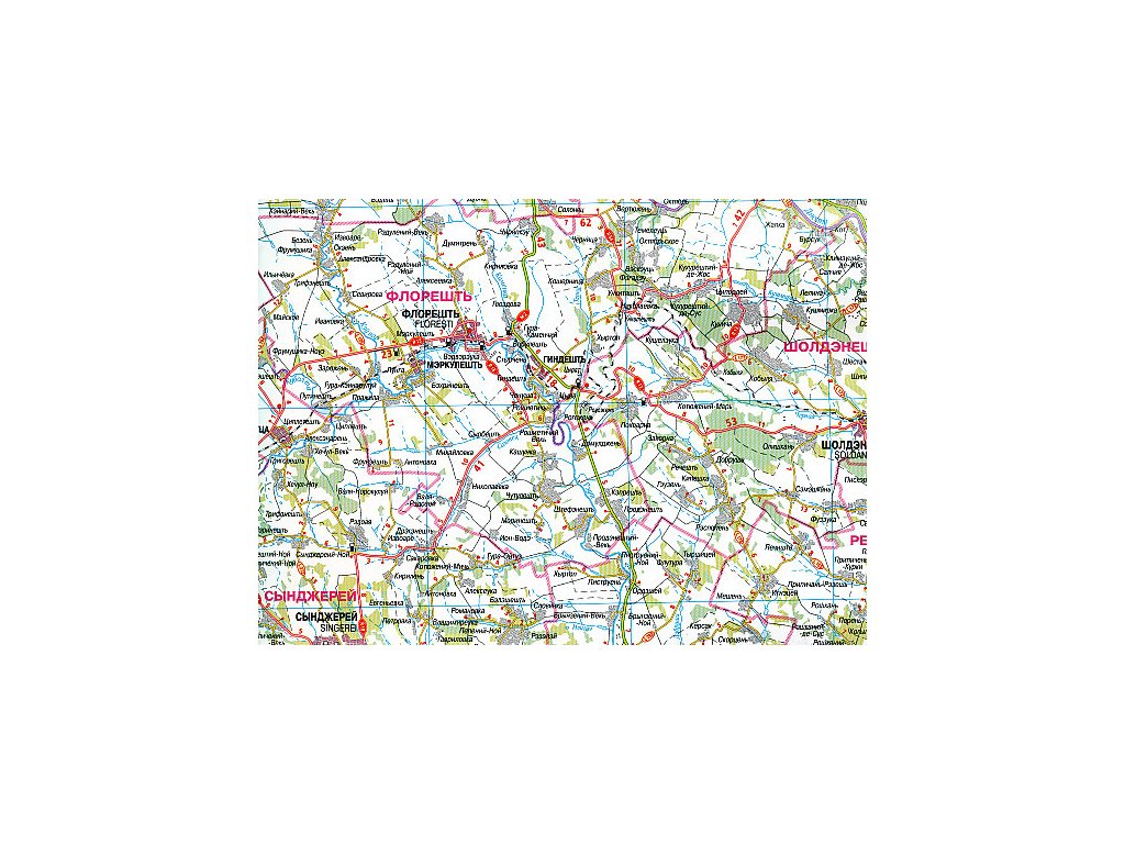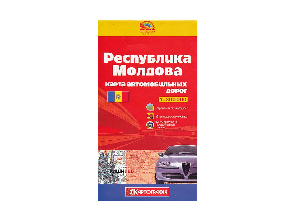 Oboustranná regionální automapa Moldávie v měřítku 1:300 000. Základem mapy je silniční síť s kilometráží, která je doplněna symbolickými znaky pro benzínové stanice. Zakresleny jsou i obecní silnice a cesty. Popis v azbuce, u větších sídel i latinkou, legenda, tabulka vzdáleností, rejstřík míst. Vydání 2014.