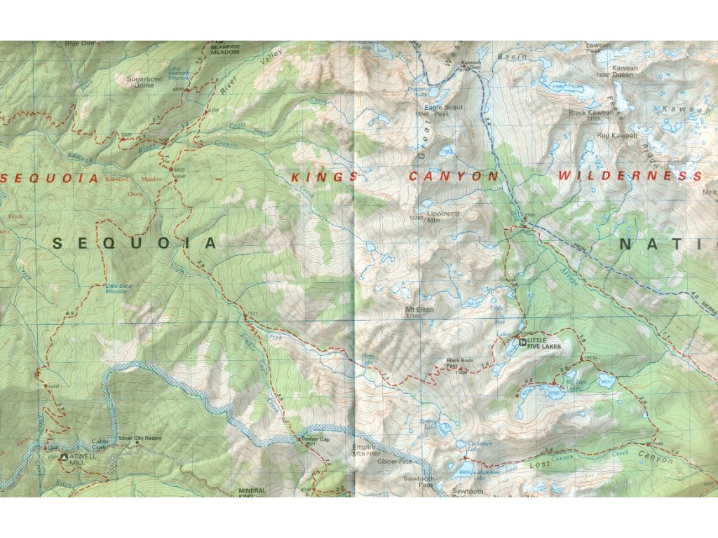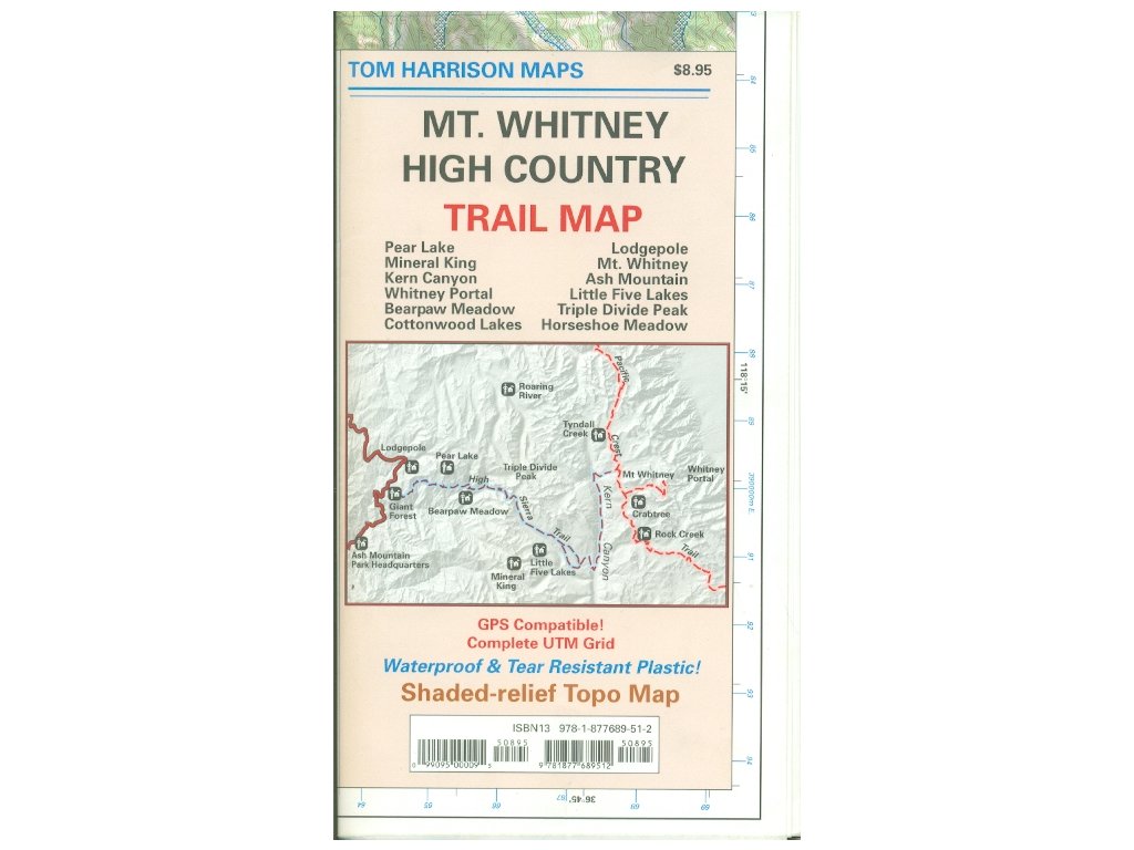 Jednostranná turistická mapa, turistické trailové značení s kilometráží, vrstevnice po 80 stopách, souřadnice GPS 1927 North American datum, UTM zone 11.