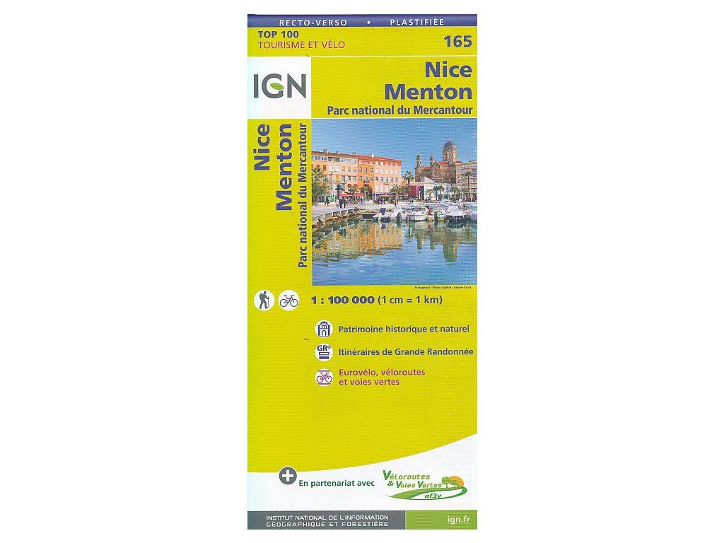 Série map 1:100 000 od firmy IGN pokrývá celé území Francie. Jednotlivé listy mají poměrně velké územní pokrytí, proto jsou využívány hlavně pro cykloturistiku, ale hodí se i pro pěší turistiku a cesty autem. V této jednostranné cykloturistické mapě naleznete pásové cyklistické značení a dálkové turistické trasy GR. Silnice jsou rozlišeny do 8 kategorií, nechybí kilometráž úseků, symbolické znaky pro turistické zajímavosti (kulturní, přírodní památky) a volnočasové aktivity. Výškopis pomocí vrstevnic po 20/40 m, stínovaný reliéf. GPS souřadnice v systému UTM WGS84. Vymezené území: JV-Antibes, JZ-Vidauban, SZ-Allos, SV-Pointe Marguareis (2650 m n. m.). Vydání 2019.