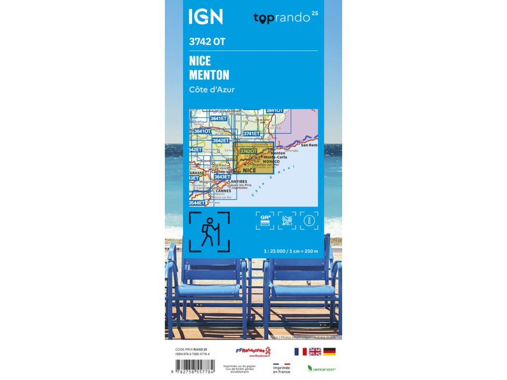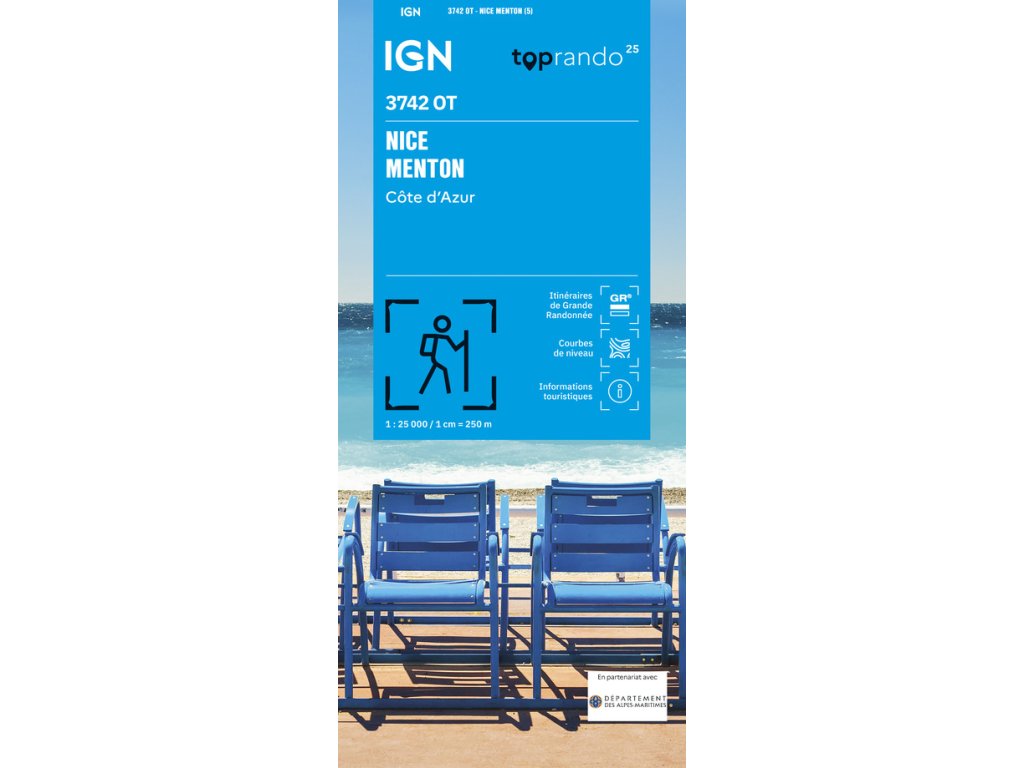 Nejznámější série turistických map pro Francii. Jednostranná turistická mapa od firmy IGN s dobrým topografickým podkladem. Obsahuje turistické značení, symbolické znaky pro turisticky významné objekty a lokality (muzea, možnosti ubytování, volnočasové aktivity,...). Výškopis pomocí stínovaného reliéfu a vrstevnic po 10 m. Mapa obsahuje GPS souřadnice v systému UTM WGS84. Vymezené území: JV St-Jean-Cap-Ferrat, JZ St-Laurent-Var, SZ le Rouccias, SV Monte Cogarda. Vydání 2026.