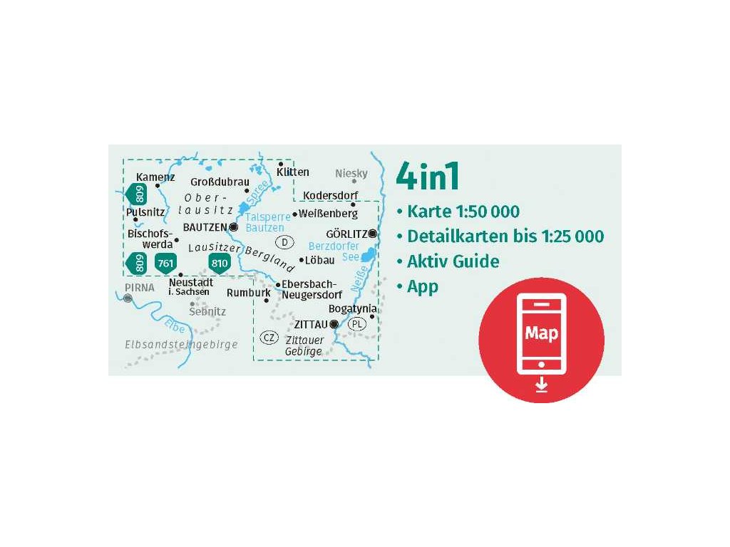 Oboustranná turistická mapa vydavatelství Kompass. Mapa je v laminované podobě (odolná vůči dešti a protržení). Obsahuje turistické a cykloturistické pásové značení doplněné o číslo a typ cesty. Mapa obsahuje množství symbolických znaků pro turisticky zajímavé objekty, kulturní zajímavosti, přírodní úkazy, informační kanceláře a ubytovací zařízení množství symbolických znaků pro turisticky zajímavé objekty, kulturní zajímavosti, přírodní úkazy, informační kanceláře a ubytovací zařízení. Výškopis pomocí vrstevnic po 10m, stínovaný reliéf. Mapa obsahuje souřadný systém UTM WGS84, vhodný pro GPS. V přiložené brožurce místopisný průvodce v němčině, návrhy tras a podrobnější mapky vybraných oblastí / výřezů z mapy. Vymezené území na jedné straně: JV-Löbau, JZ-Stolpen, SZ-Schwepnitz, SV-Klitten. Na druhé straně: JV-Chrastava, JZ-Kytlice, SZ-Malschwitz, SV-Kodersdorf, Görlitz. Vydání 2023.