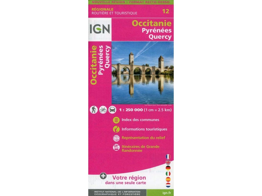Oboustranná automapa regionu Occitanie - Pyrénées od firmy IGN. Přehledná silniční síť s kilometráží, komunikace rozlišeny do 6 úrovní, železnice, lanovky. Symbolickými znaky zaznačeno velké množství turistických informací - historické památky, přírodní zajímavosti, vyhlídky, informační kanceláře, horské chaty, sportoviště. Výškopis vyjádřen pomocí vrstevnic a stínování. Mapa je kompatibilní s GPS v systému WGS 84. Vydání 2017.