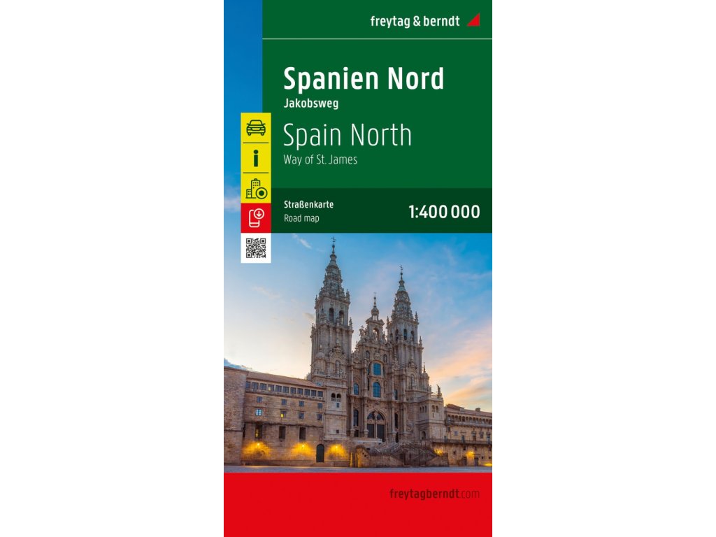oboustranná regionální automapa severního Španělska a části jižní Francie se zaměřením na Svatojakubskou stezku. Mapa 1:400 000 s bohatým turistickým obsahem je svým měřítkem vhodná pro poznávání regionu autem. Silniční síť je označena čísly komunikací, doplněna o kilometráž a čísla exitů. Vedle dopravních informací jsou zaznačeny přírodní rezervace, panoramatické cesty s krásnou vyhlídkou, kulturní zajímavosti, znaky pro hotely, kempy. Výškopis je v mapě vyznačen pomocí stínování. Zvýrazněná je hlavní trasa Svatojakubské stezky, ale i mnoho jejich variant. Přiložená brožura s popisem pamětihodností v německém a anglickém jazyce, plánky měst, rejstřík sídel. Vydání 2016.
