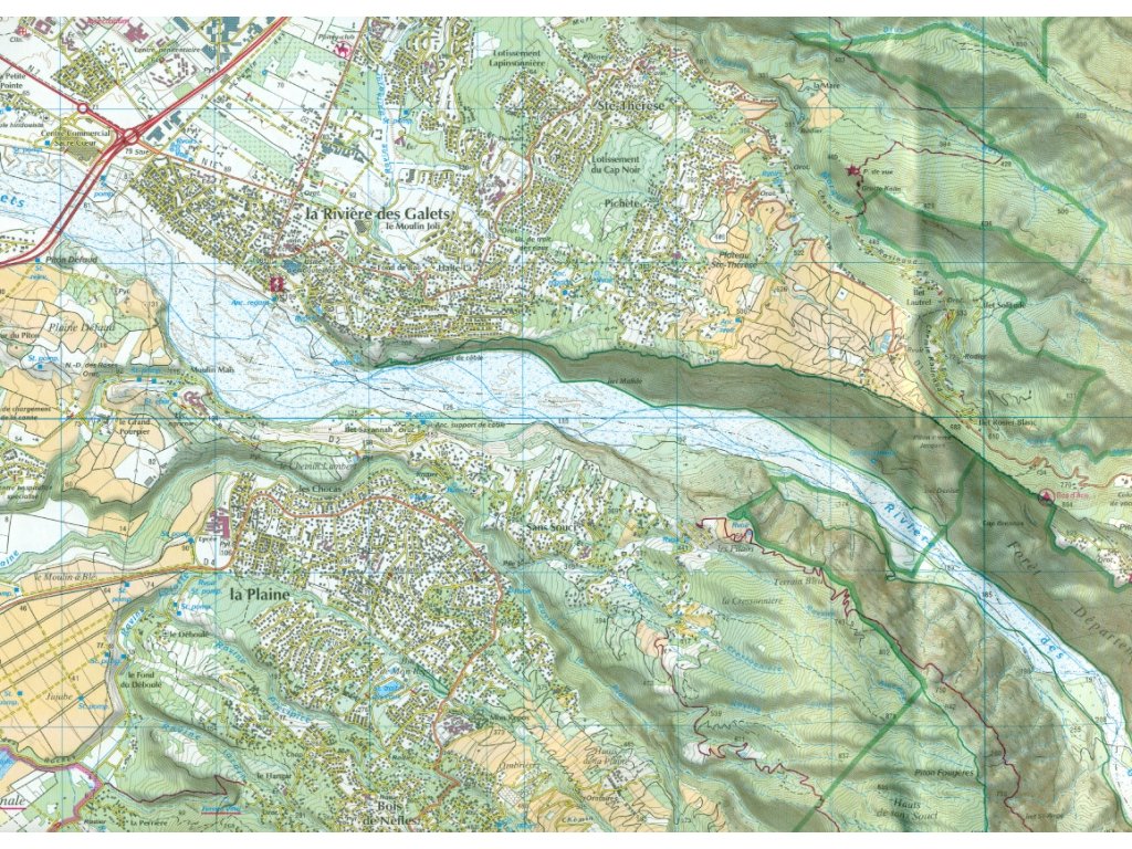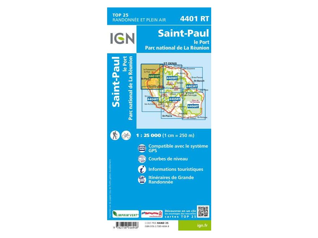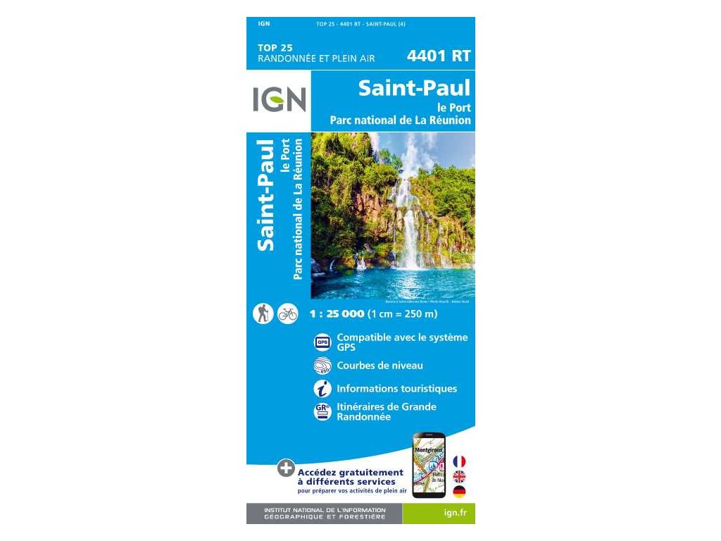 Podrobná turistická mapa části Reunionu, vrstevnice po 10 metrech, značené turistické cesty, četné turistické a outdoorové symboly, na zadní straně rejstřík.