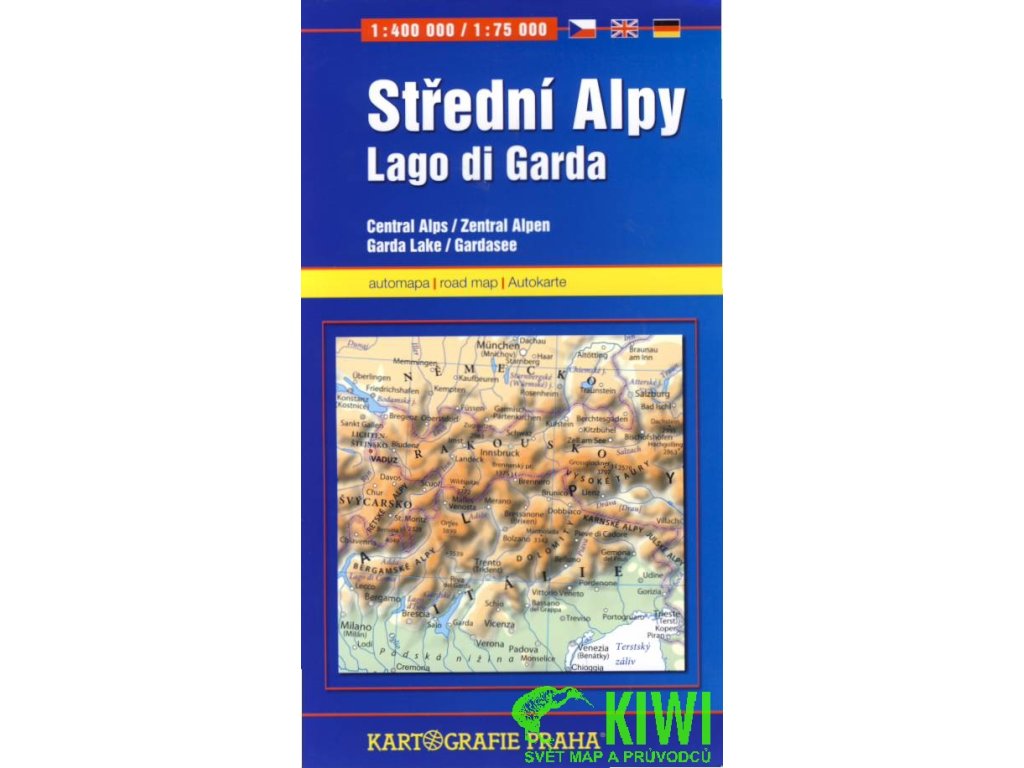 Oboustranná regionální a turistická mapa od vydavatelství Kartografie na voděodolném papíře. Z jedné strany mapy nalezente přehlednou regionální mapu středních Alp (od Mnichova po Bergamo), z druhé strany pak turistickou mapu okolí jezera Lago di Garda. Obě mapy kladou důraz na zaznačení a zvýraznění turisticky zajímavých lokalit (NP, kláštery, hrady). Silniční síť je doplněna o kilometráž, čísla silnic, benzínové stanice. V turistické mapě jsou navíc vyznačeny cykoturistické a turistické trasy, tábořiště, horské chaty. Stínovaný reliéf dobře vyznačuje výškopis aniž by příliš zaplnil mapu a učinil ji tak hůře čitelnou. Nechybí rejstřík sídel. Legenda a veškeré textové poznámky v češtině. Vydání 2005.