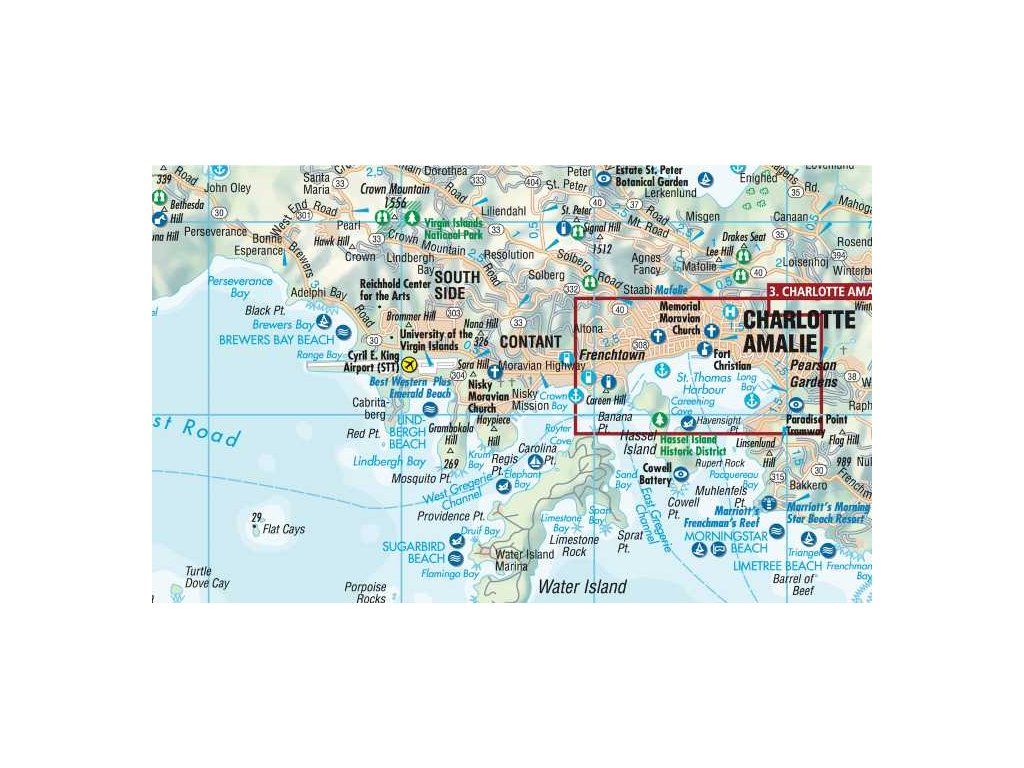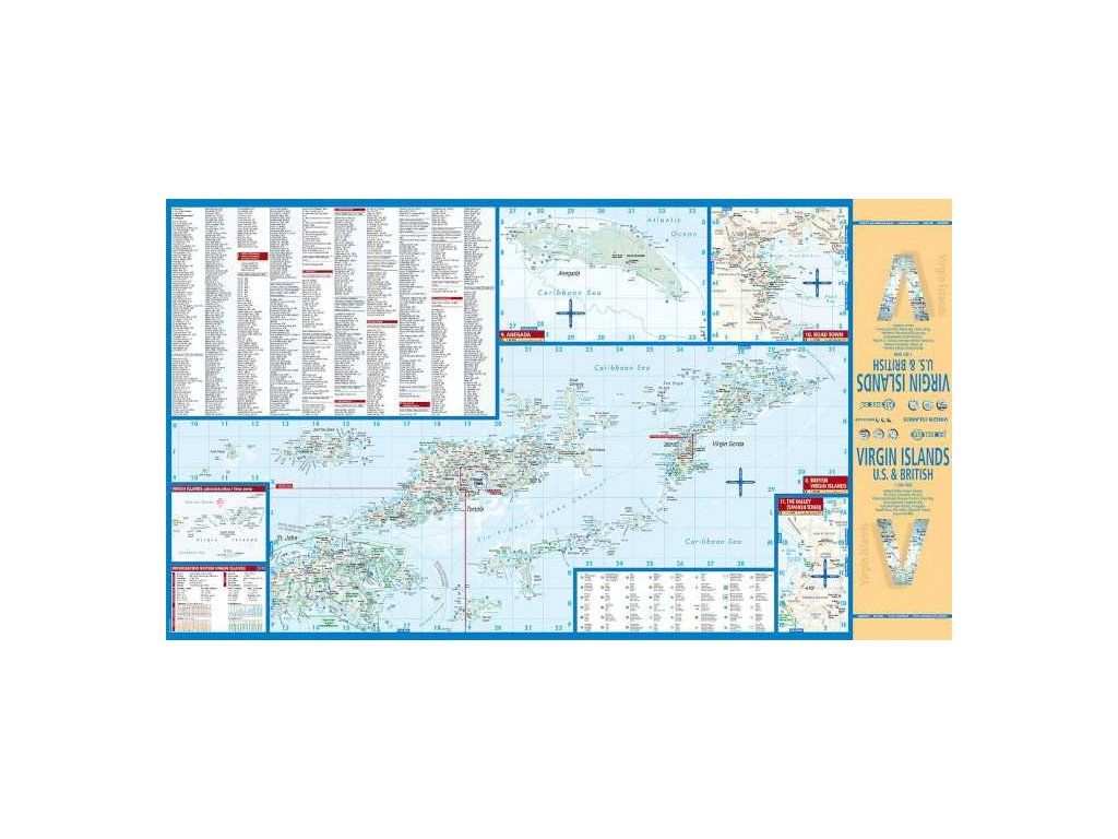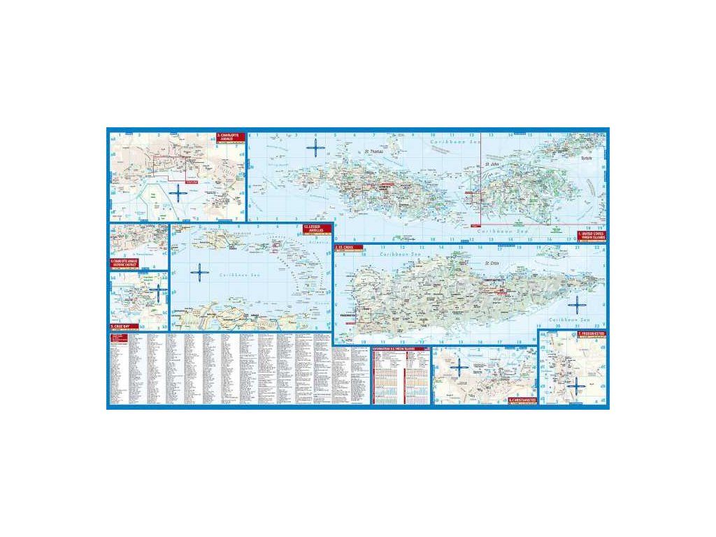 Oboustranná mapa Panenských ostrovů v laminové úpravě. Mapa je složena z několika výřezů, kdy každému ostrovu je věnován jeden. Mapy se stínovaným reliéfem, sítí hlavních silnic a především s turistickými znaky pro kulturní a přírodní památky, možnosti ubytování a informační kanceláře. Dále mapa obsahuje podrobnější mapky měst Frderiksted, Christiansted, Charlotte Amalie, Road Town. Rejstřík sídel a ulic, stručné geografické info. Koupí získáte jak přehlednou turistickou mapu celého území tak plány nejvýznamnějších měst a turistických destinací. Vydání 2014.