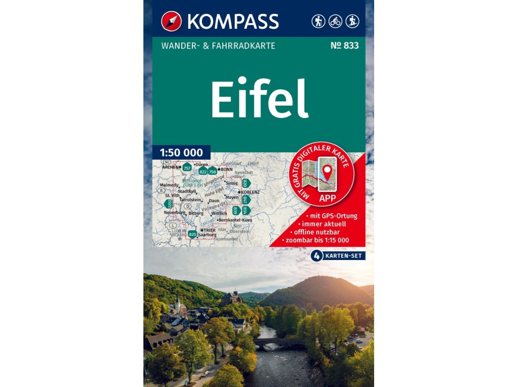 Soubor čtyř oboustranných turistických map od vydavatelství Kompass pro německé pohoří Eifel. Oblíbené turistické mapy pro německy mluvící země. V mapách naleznete turistické a cykloturistické pásové značení doplněné o číslo, způsob značení a typ cesty. Pro mapy je charakteristické velké množství symbolických znaků pro turisticky významné prvky a objekty (památky, ubytování, outdoorové aktivity, topografické prvky), výškopis pomocí vrstevnic po 20 m. Souřadnice pro GPS v systému UTM WGS 84. Zobrazené území: J-Trier, Z-Clervaux, malmedy, SZ-Aachen, SV-Bonn, V-Koblenz. Vydání 2025.