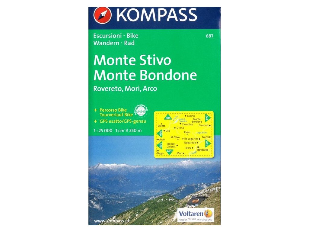Turistická mapa Kompass oblasti Monte Stivo, Bondone, Rovereto, Mori, Arco v měřítku 1:50 000. Mapa obsahuje všechny zančené turistické a cykloturistické trasy ( včetně MTB tras), zajímavosti a pamětihodnosti. Kompatibilní s GPS.