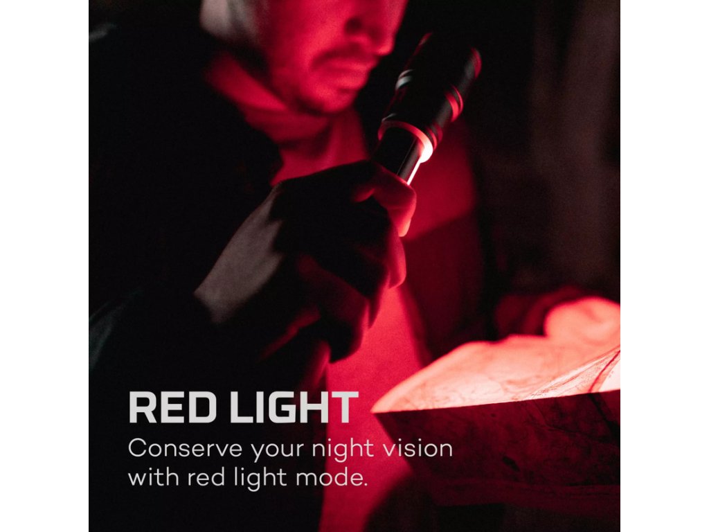 • Červená vysoká (40 lumenů): 5,5 hodiny / 9 metrů