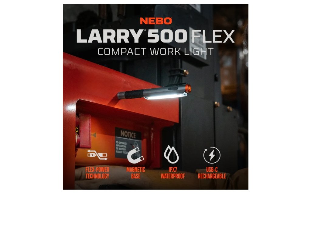 Larry 500 FLEX je kompaktní pracovní svítilna s 500 lumeny využívající technologii Flex-Power, jež umožňuje napájení z dodávané dobíjecí baterie 10850 nebo ze 2 baterií AAA. Je vybaveno ocelovým klipem na kapsu a silným magnetickým podstavcem pro pohodlné osvětlení bez použití rukou.