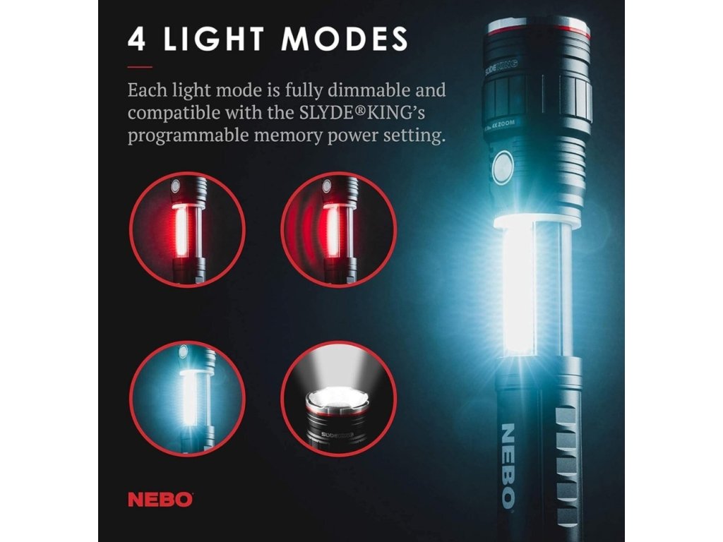 NEBO Slyde King 500 je robustní a výkonná svítilna s univerzálním použitím. S kombinací bodového a COB světla, zoomem, magnetem, voděodolností a stmíváním představuje skvělou volbu pro domácí dílny, outdoor i náročné terény.
