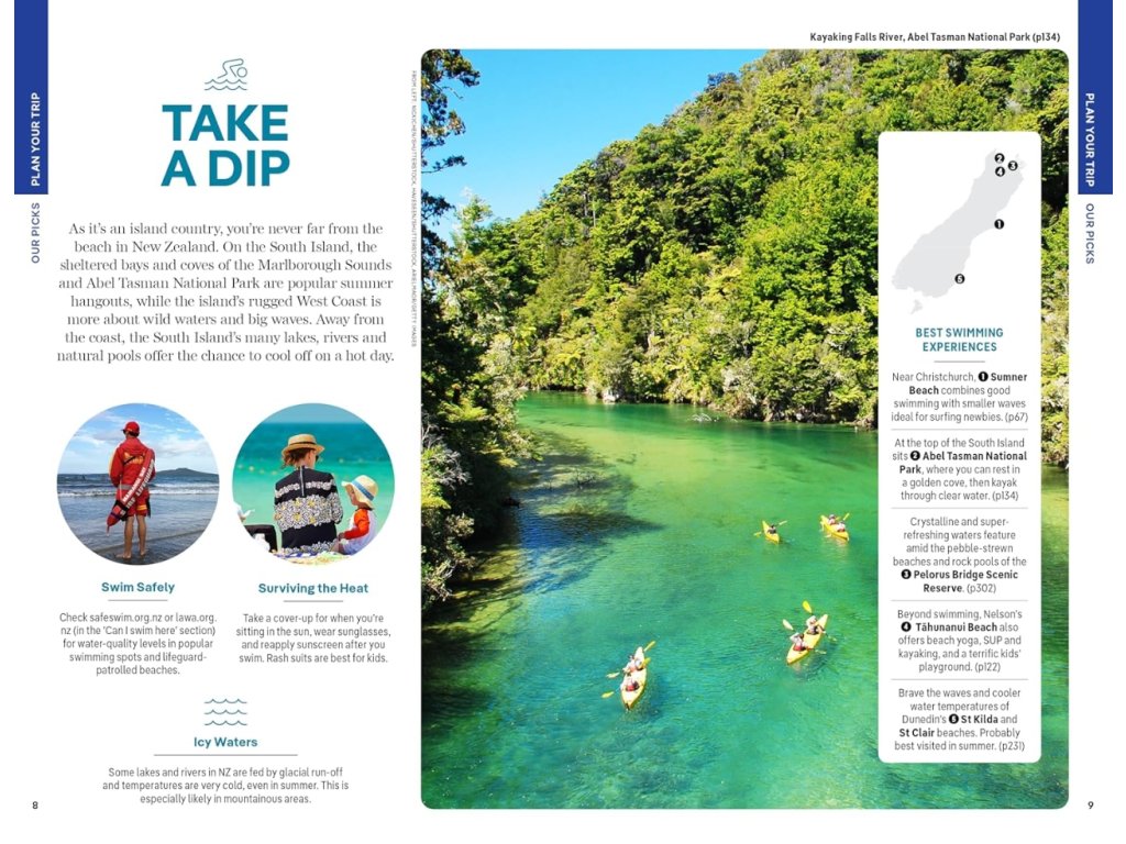 Zahrnuté oblasti: Úvodní kapitoly pro plánování, Marlborough, Nelson, Západní pobřeží, Christchurch, Canterbury, Dunedin, Otago, Queenstown, Wanaka, Fiordland, Southland a kapitoly Porozumění zemi a Přežití.