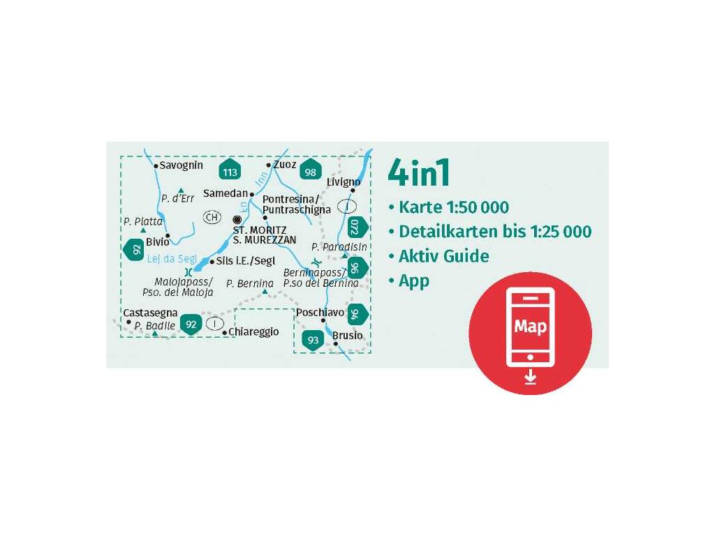 Mapa oblasti Oberengadin/Alta Engadina - turistická mapa od vydavatelství Kompass obsahuje aktuální značené turistické trasy, doporučené cykloturistické trasy a kompletní informace o turistických zajímavostech v okolí. A to vše na kvalitním topografickém mapovém podkladu. Podpora GPS je samozřejmostí.