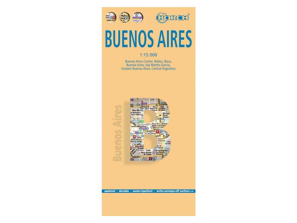 Plán Buenos Aires v laminované úpravě (odolný vůči dešti a roztržení) je složen z vícera map. Dominantní je podrobná mapa města (1:15 000) obsahující symboly pro turisticky významné lokality (hotely, restaurace, muzea, divadla, památky, parkoviště), barevně odlišeny veřejné budovy. V dalších výřezech je pak zobrazen detailnější plán čtvrti Boca (1:15 000), Núňez (1:15 000), ostrova Martin Garcia (1:18 000), dále naleznete mapu okolí města (1:75 000) s turistickými symboly, mapu střední Argentiny (1:3 000 000) a schematickou mapu městské dopravy. Nechybí rejstřík ulic, informace o městě a seznam 30 nejzajímavějších památek. Vydání 2024.