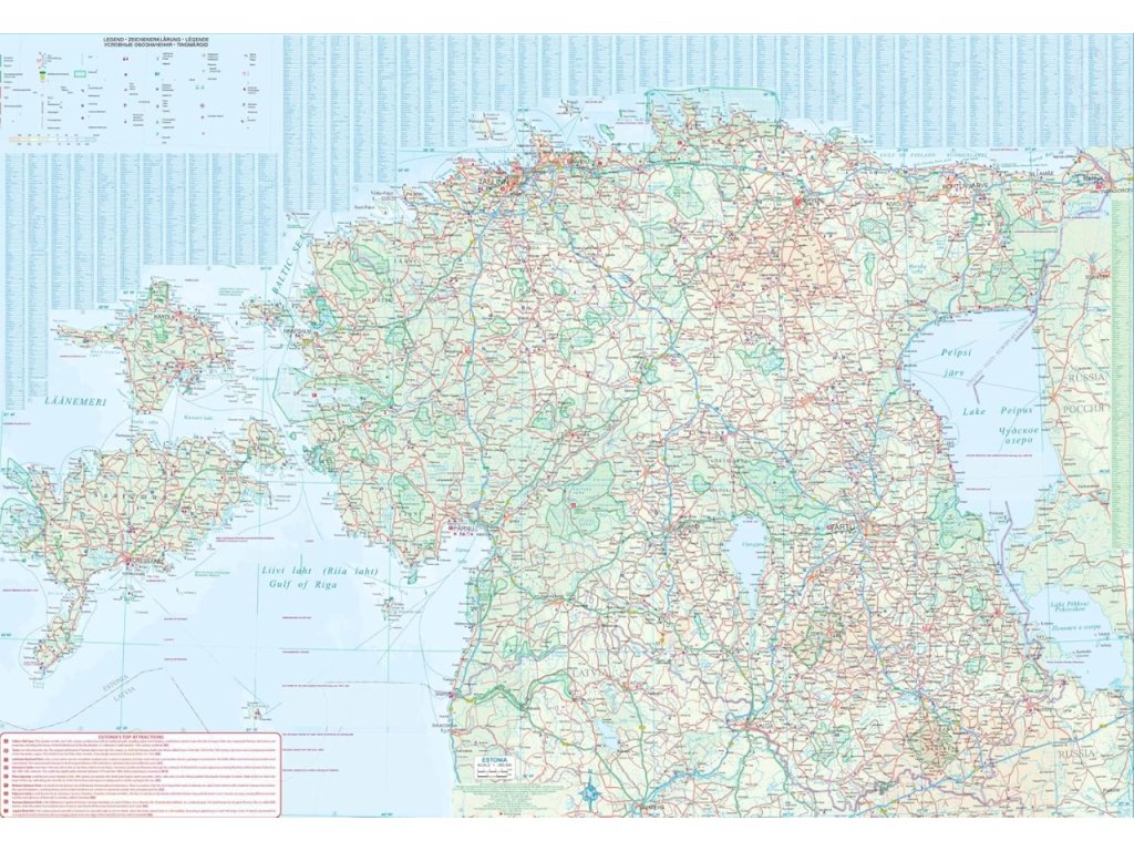 Jednostranný, přehledně zpracovaný plán Tallinu. Zvýrazněny hlavní dopravní tahy, barevně rozlišeny veřejné budovy, turistické atrakce, parky, průmyslové areály, hřbitovy. Symbolickými znaky jsou vyznačeny služby (nemocnice, obchodní centra, pošty, čerpací stanice, hotely, kina, divadla) a turistické cíle (kostely, muzea, místa s výhledem). Vyznačeny jsou i cyklostezky. Navíc jsou v mapě zvýrazněny trasy městské dopravy, včetně zastávek. Centrum města v podrobnějším měřítku. Dále naleznete rejstřík ulic, přehledovou mapku Estonska a schéma městské hromadné dopravy. Na rubové straně mapa Estonska v měřítku 1:400 000. Jedná se o silniční mapu, která je členěna do 5ti úrovní, doplněno o čísla silnic u vyšších řádů. Výškopis znázorněn pomocí barevné hypsometrie. Vyznačeny národní parky. Piktogramy jsou pak vyznačena místa pro turistu zajímavá či užitečná, např.: katedrály, kostely, muzea, majáky, větrné a vodní mlýny, hotely, kempy, parkoviště, pláže, vodopády a mnoha dalších. Rejstřík sídel. Vydání 2025.