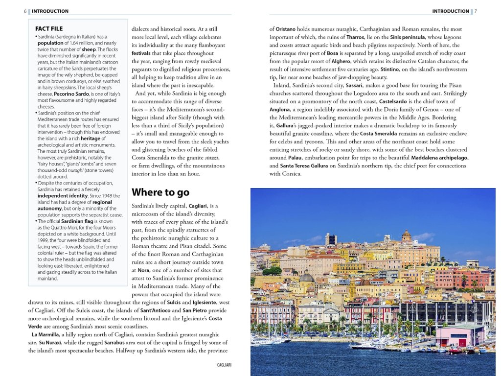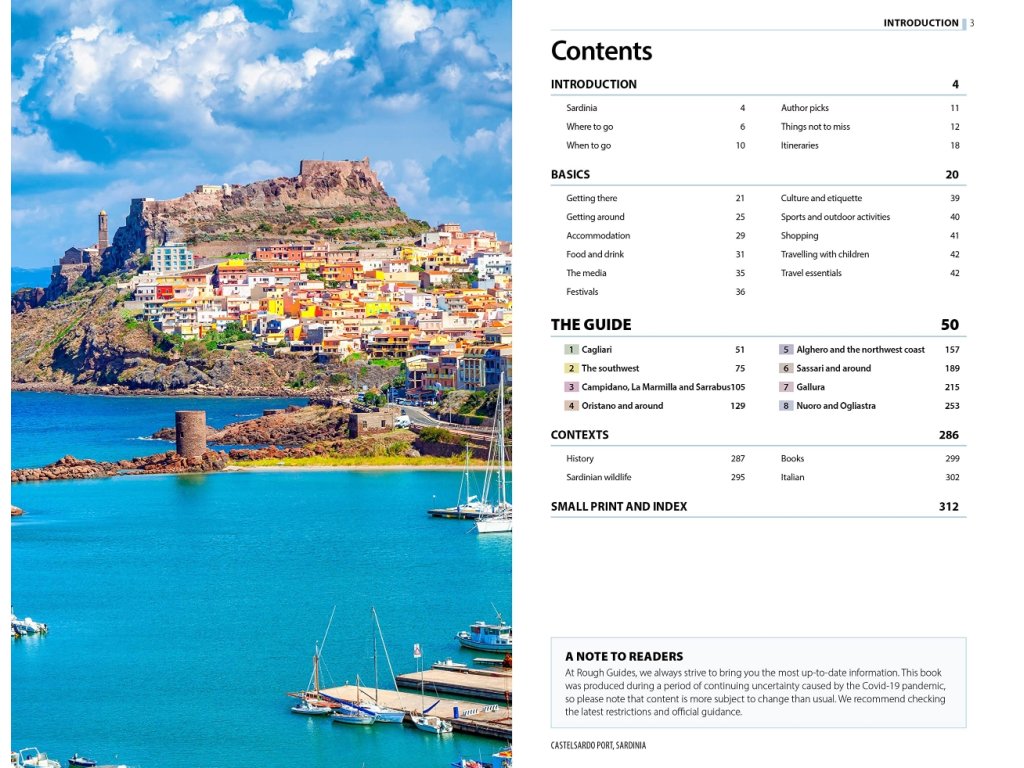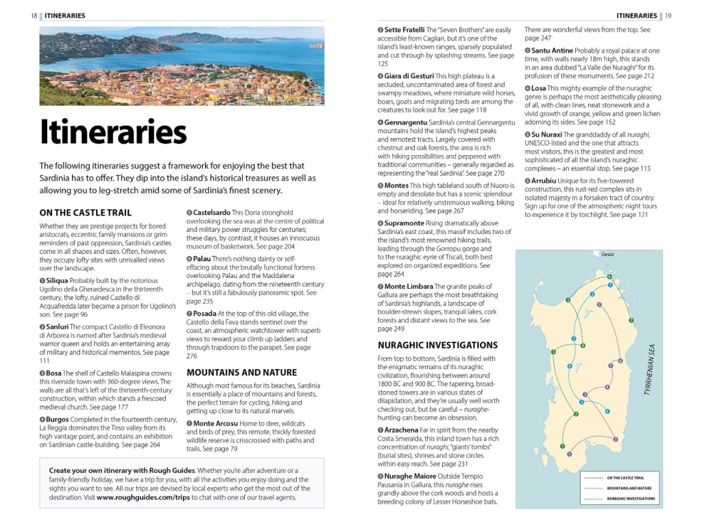 Průvodce Rough Guide po Sardinii je plný praktických rad, co vidět a dělat - od galerií a archeologických nalezišť po horské túry a pláže - a také popisů nejlepších hotelů, barů a restaurací pro všechny finanční možnosti. Věnuje se také okázalým festivalům a bohaté historii ostrova, stejně jako méně známým aspektům, jako je průmyslové dědictví, literatura, řemesla a kulinářské tradice. Nechybí ani trasy pro pěší turistiku a jízdu na koni, vodní sporty a cyklotrasy, zatímco v „Top 5 boxech“ jsou vybrány ty nejzajímavější místa, která byste si neměli nechat ujít.