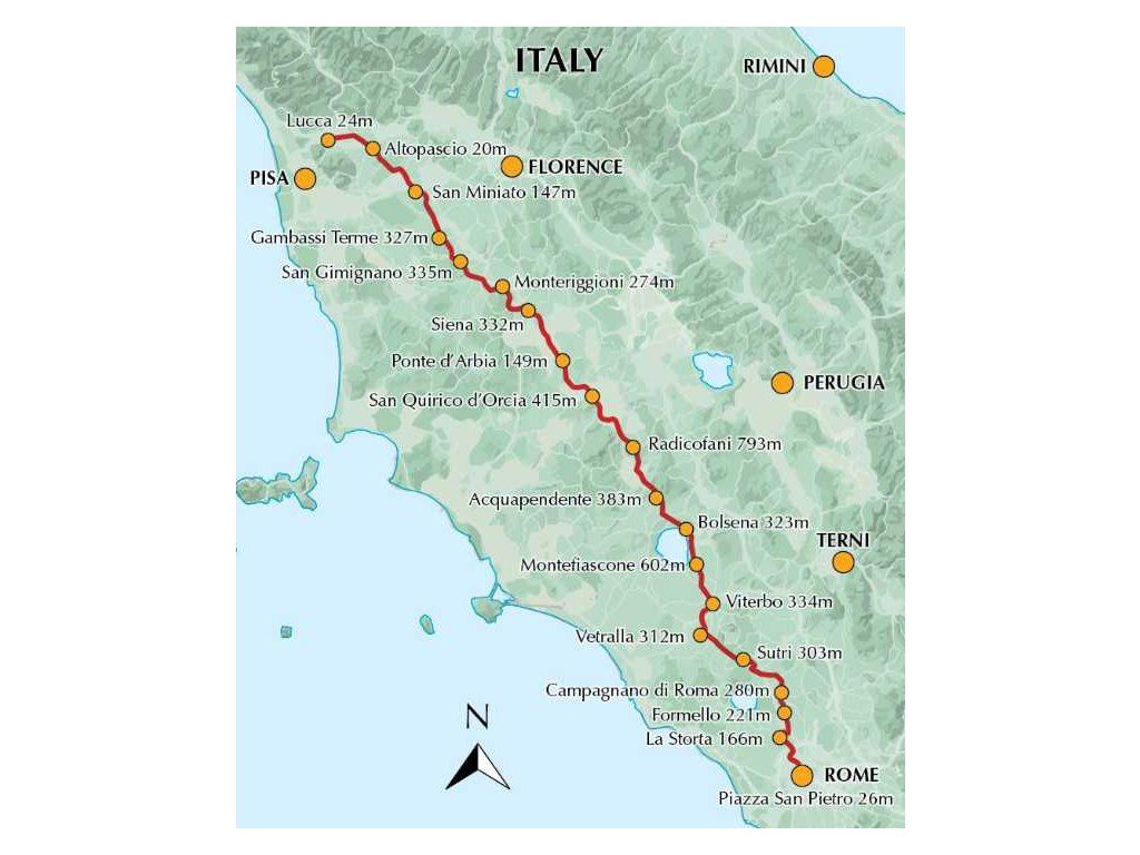 Kromě strmého sestupu z průsmyku Velký Svatý Bernard (2473 m), úseku přes průsmyk Cisa (1041 m) a neustálých stoupání a klesání v Toskánsku nepředstavuje tato trasa žádné obtíže pro kohokoli v normálním zdravotním stavu, kdo je přiměřeně fyzicky zdatný