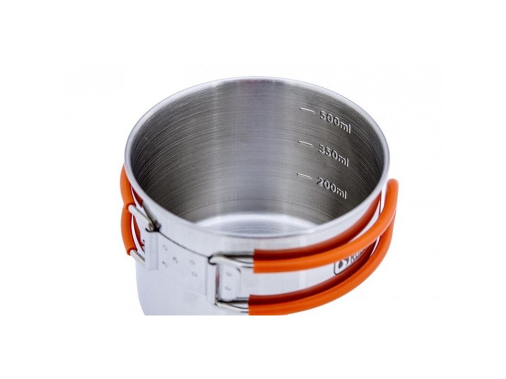 Hrnek je vybaven speciálními sklopnými rukojeťmi, které jsou chráněny před teplem speciální krytkou. Díky označené odměrce umožňuje odměřit množství nalévané tekutiny nebo dávkovaných potravin. Bude dobře fungovat jak jako hrnek pro přímé pití, tak pro ohřívání nápoje v něm na ohni.