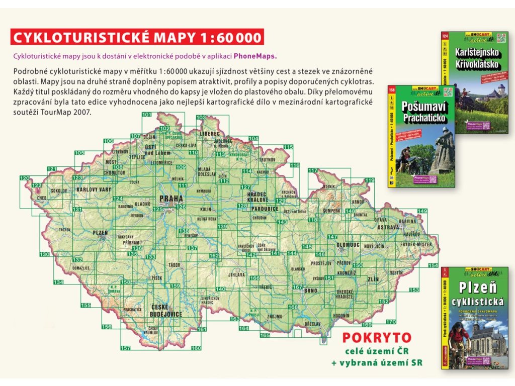 Podrobná cykloturistická mapa v měřítku 1:60 000 obsahuje značené i doporučené cyklotrasy v oblasti. Na zadní straně mapy je textový popis turistických zajímavostí, profily tras a detailnější popis vybraných cyklostezek. Mapa má praktický kapesní formát a je dodávána s plastovým pouzdrem. Pokryta je celá ČR.
