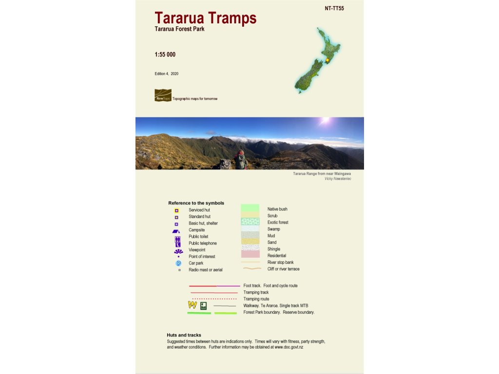 Turistická mapa oblasti Tararua Tramps u Wellingtonu na precizním topografickém podkaldu s veškerými turistickými informacemi (trasy,chaty, kempy a apod.) v měřítku 1:50000 .