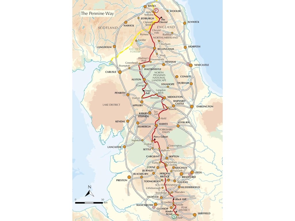 Edale, Crowden, Hebden Bridge, Cowling, Gargrave, Malham, Horton in Ribblesdale, Hawes, Keld, Bowes, Middleton-in-Teesdale, Dufton, Alston, Hadriánův val, Bellingham, Byrness, Kirk Yetholm.
