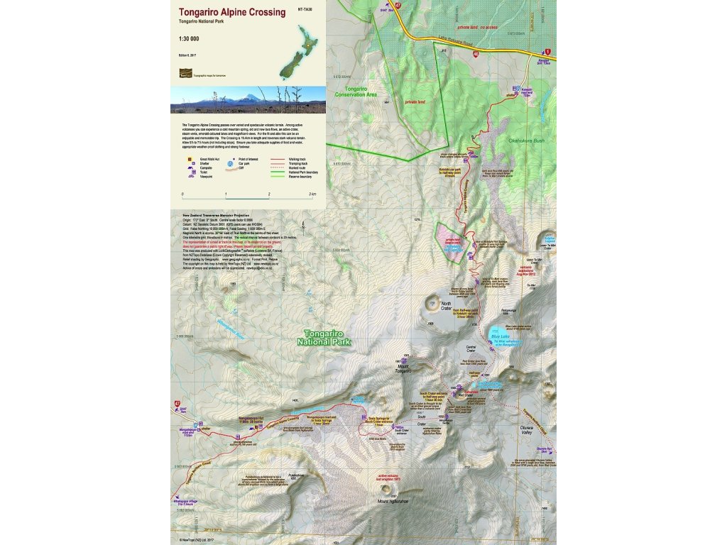 Turistická mapa oblasti Tongariro Alpine Crossing na precizním topografickém podkaldu s veškerými turistickými informacemi (trasy,chaty, kempy a apod.) v měřítku 1:40 000 .