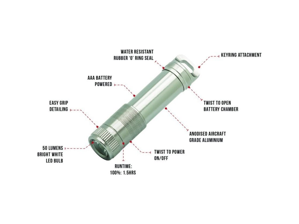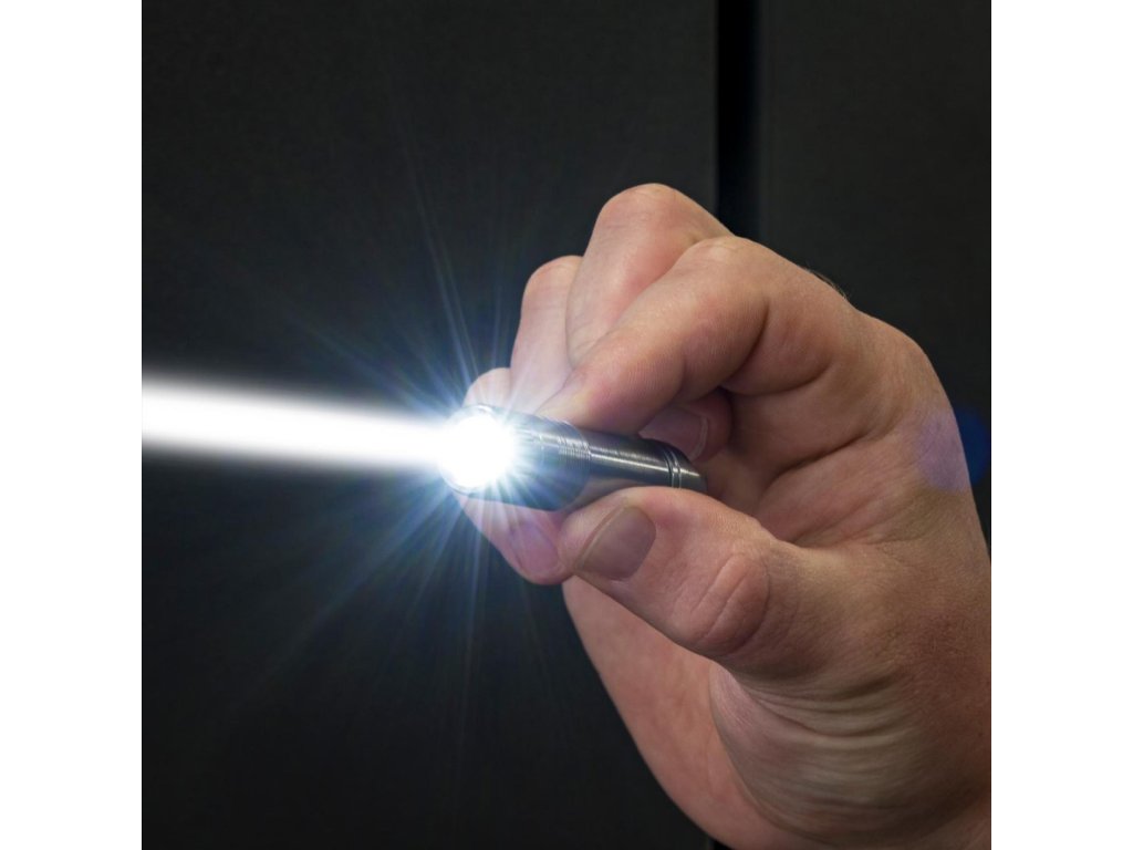 Tělo je vyrobené z eloxovaného letecké hliníku, který je velmi pevný a odolný. Svítilna je odolná vůči vodě a díky zdířce pro připojení ke klíčům ji můžete mít stále u sebe.